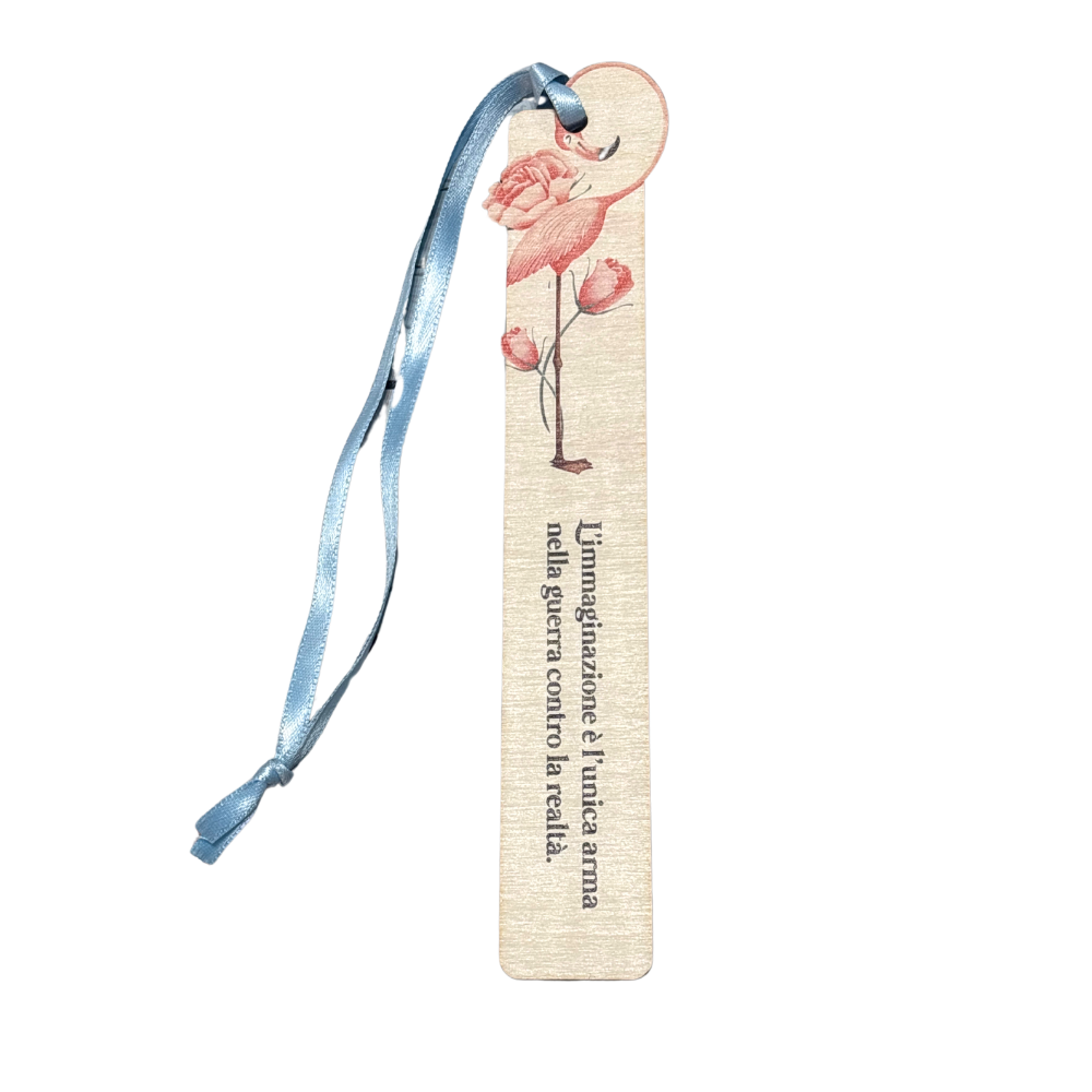 Arricchito da un nastrino rosa o azzurro, bigliettino "Pensierini su legno, emozioni naturali" e la stampa della scritta "L'immaginazione è l'unica arma nella guerra contro la realtà".