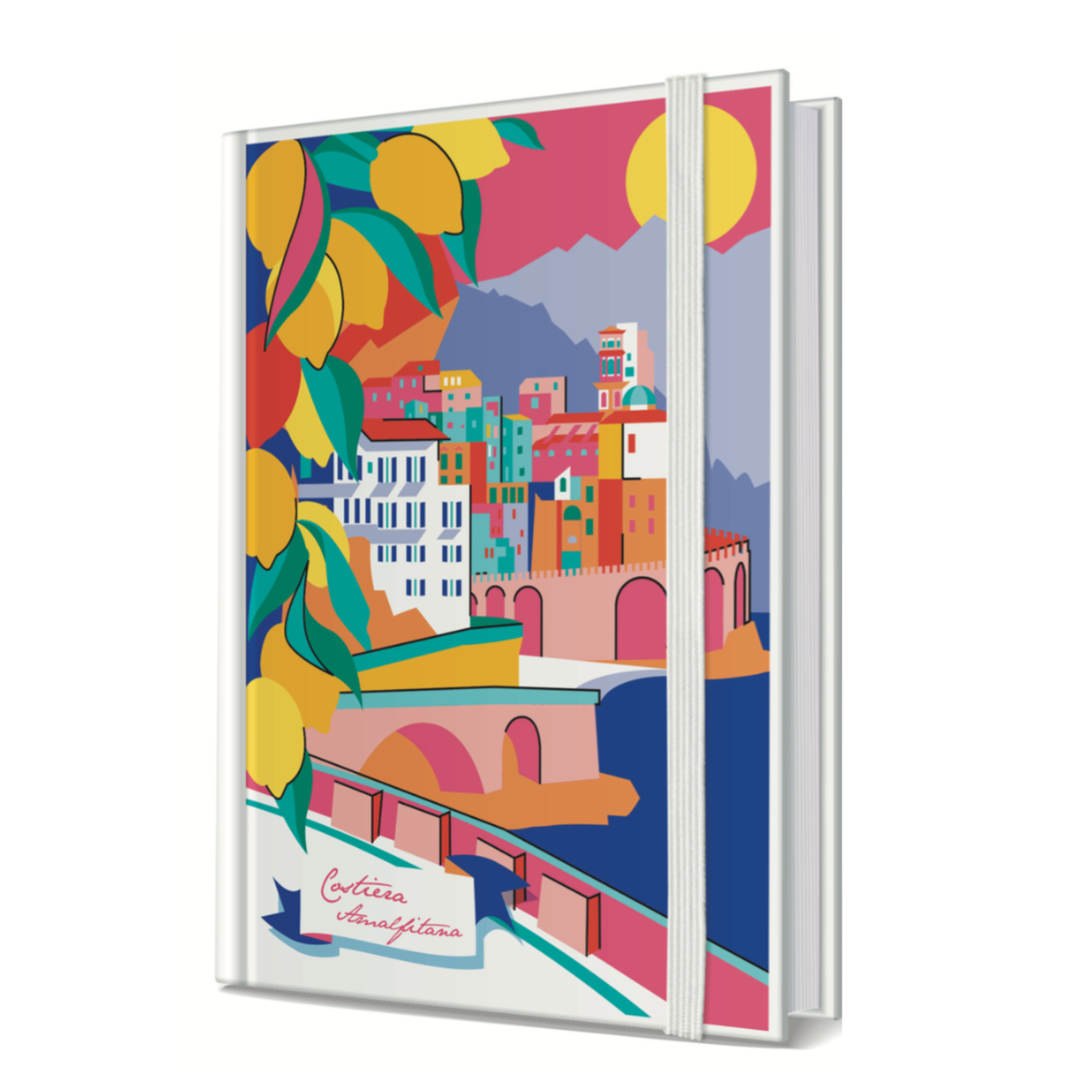 Quaderno A5, copertina rigida illustrata con raffigurata la Costiera Amalfitana, pagine a righe color avorio con elastico in tinta.
