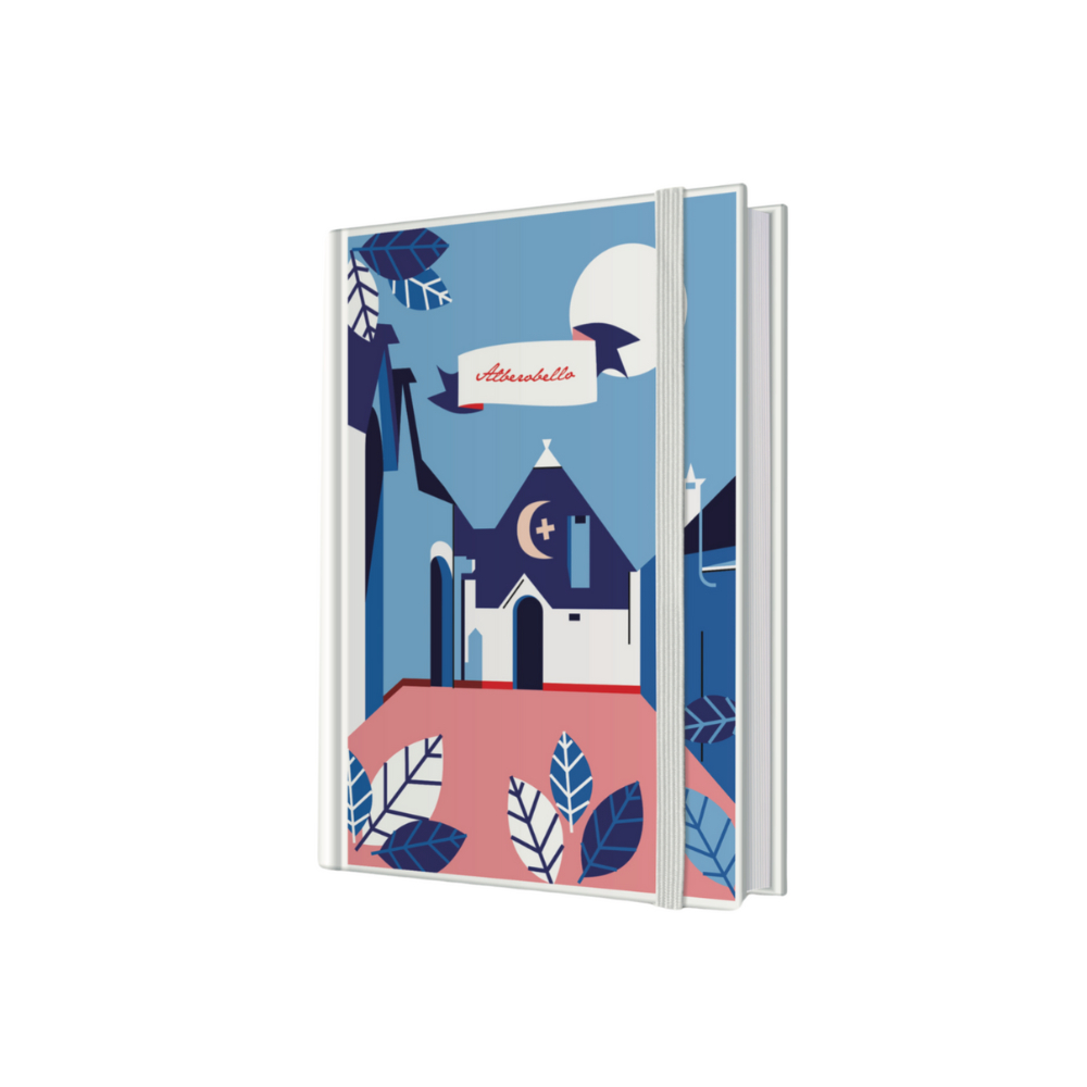 Quaderno A5, copertina rigida illustrata con raffigurata la città di Alberobello, pagine a righe color avorio con elastico in tinta.
