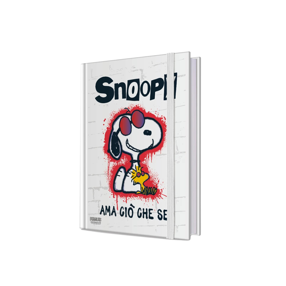 Quaderno A6, copertina in carta kraft rigida illustrata con l'immagine di Snoopy e la scritta "Ama ciò che sei" con pagine a righe color avorio.