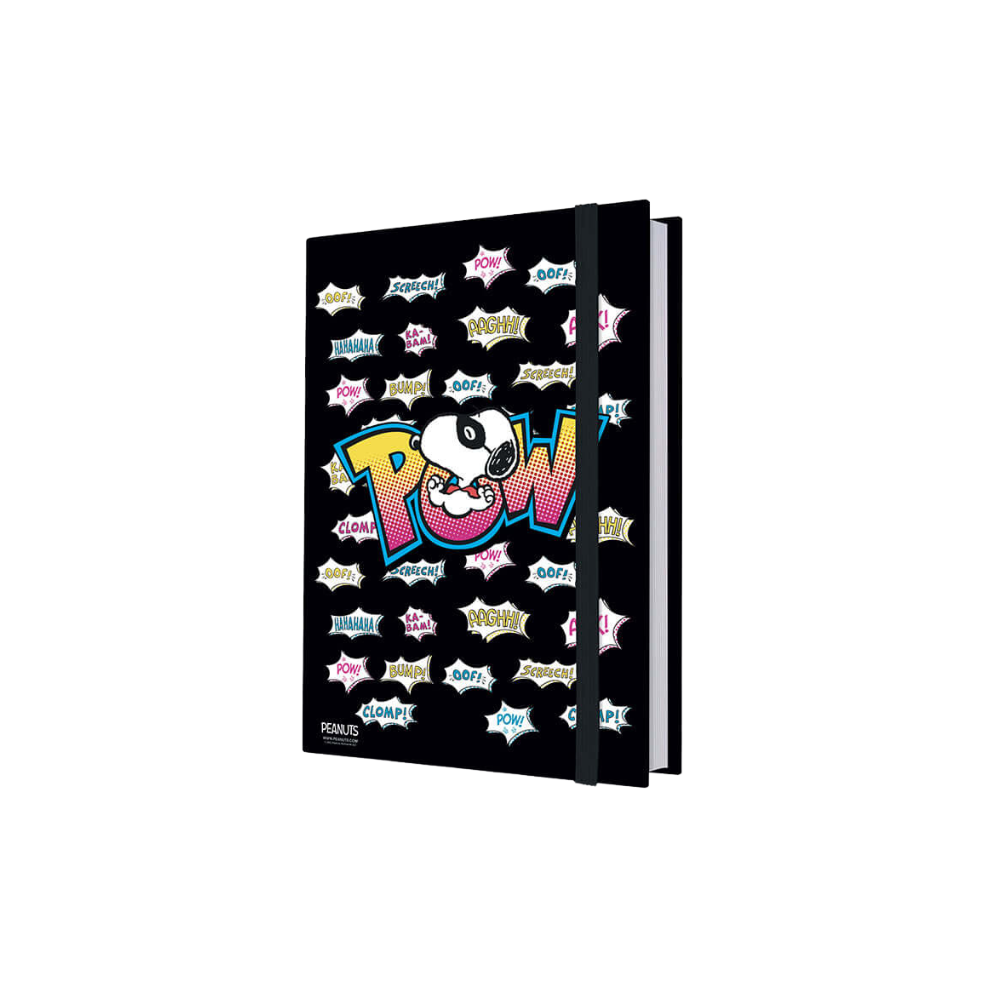 Quaderno A6, copertina in carta kraft rigida illustrata con l'immagine di Snoopy e la scritta "Pow" con pagine a righe color avorio.