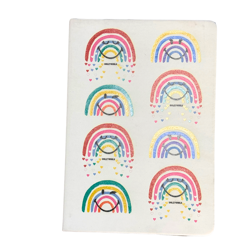 Quaderno A5, copertina rigida con raffigurati degli arcobaleni e delle faccine, pagine a righe color avorio con elastico in tinta.