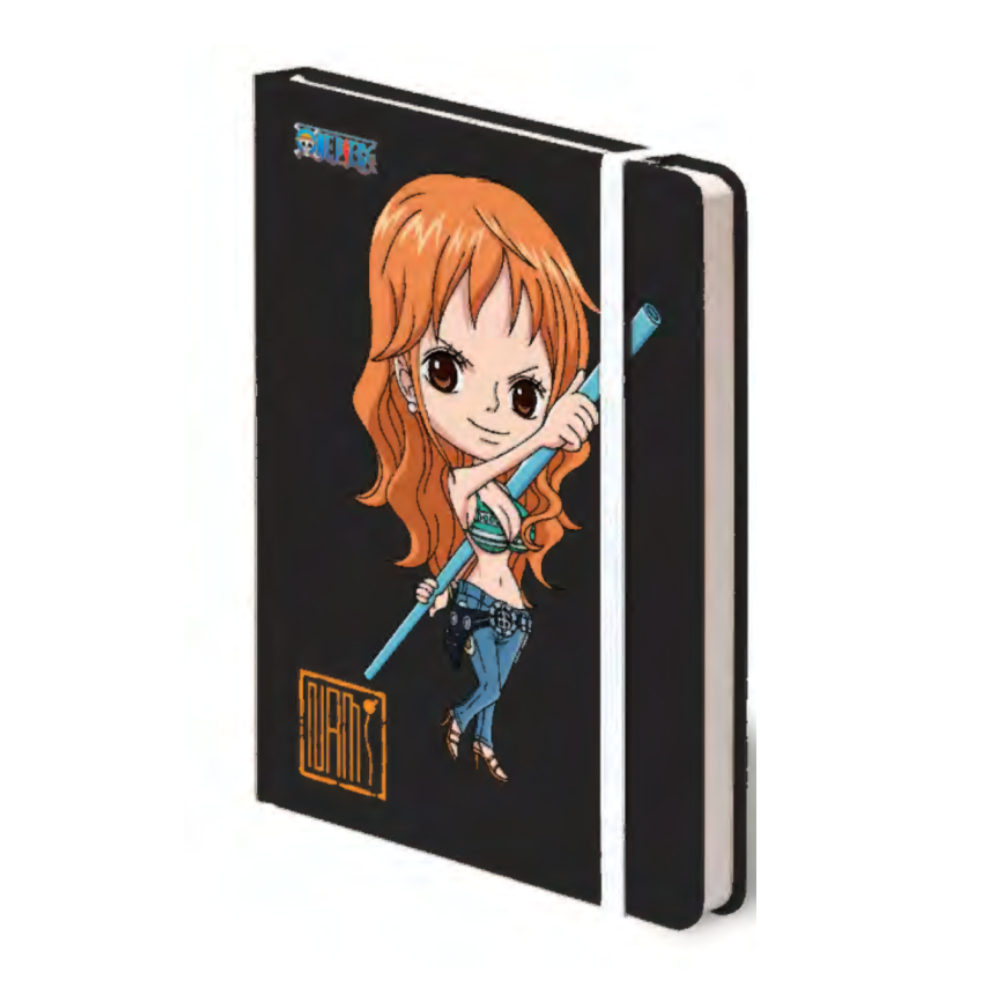 Quaderno A5, copertina rigida con raffigurata Nami, pagine a righe color avorio con elastico in tinta.