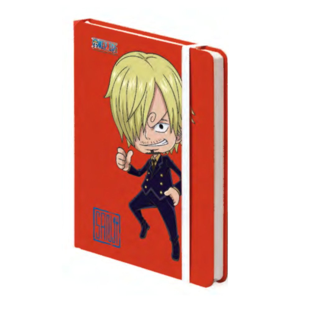 Quaderno A5, copertina rigida con raffigurato Sanji, pagine a righe color avorio con elastico in tinta.
