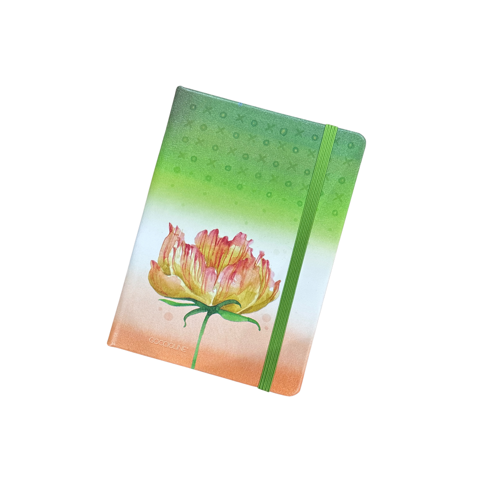 Quaderno A6, copertina rigida illustrata con un fiore grande, 96 pagine lisce color avorio e chiusura con elastico in tinta, 100% made in Italy!