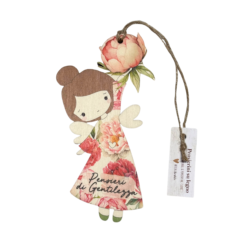 Angelo dei Pensieri di Gentilezza, in legno con un rosa e cordoncino.