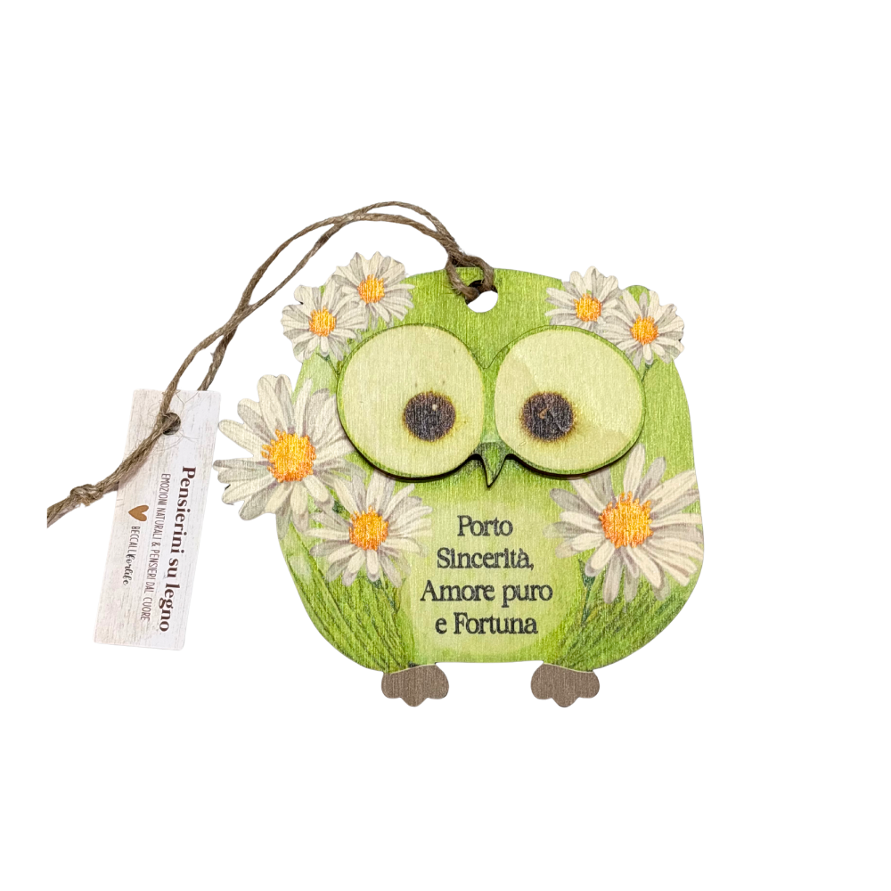 Gufetto con margherite, la scritta "Porto Sincerità, Amore puro e Fortuna" e cordoncino per appenderlo.
