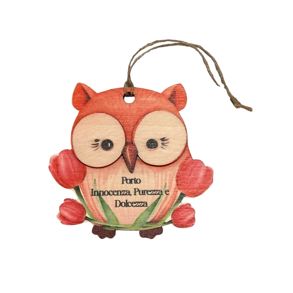 Gufetto con tulipani, la scritta "Porto Innocenza, Purezza e Dolcezza" e cordoncino per appenderlo.