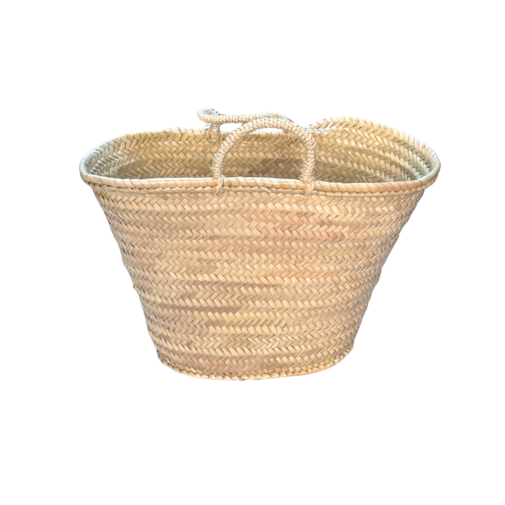 Borsa intrecciata a due manici, in palma naturale, realizzata con lavorazione artigianale, di media dimensione.