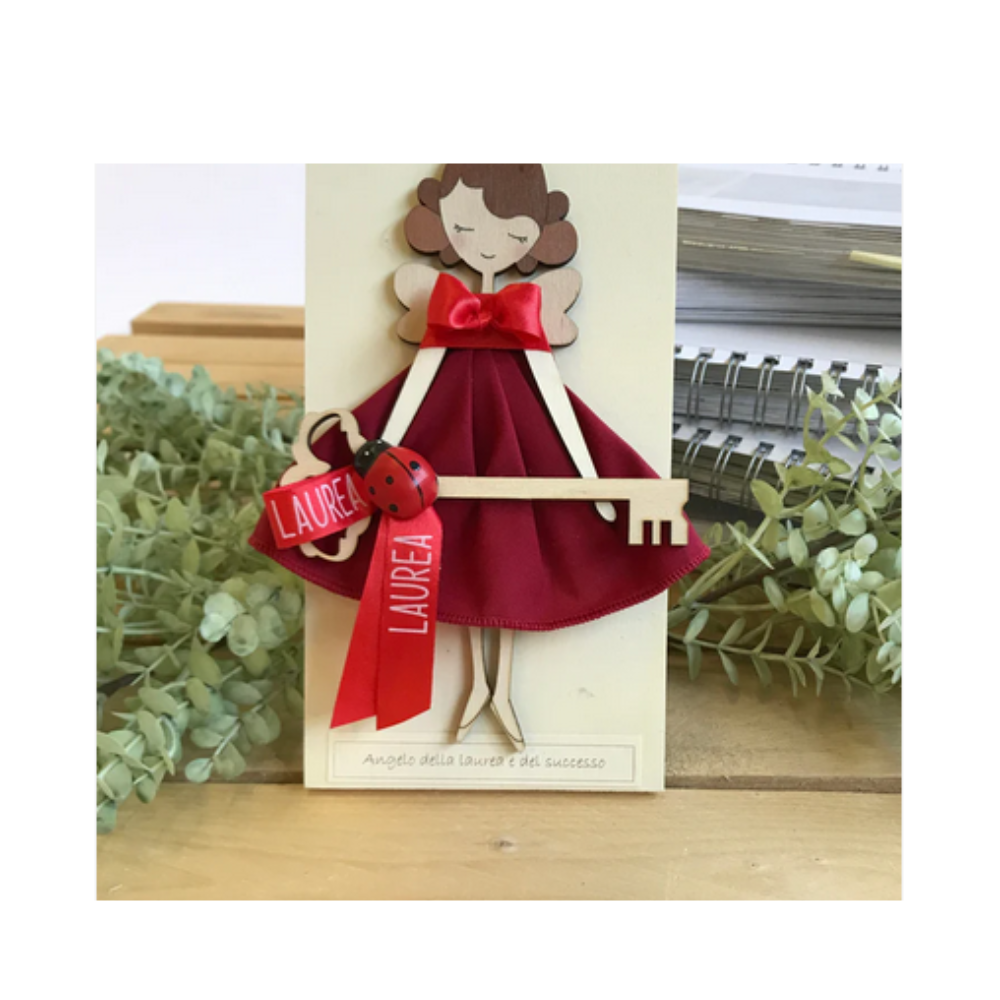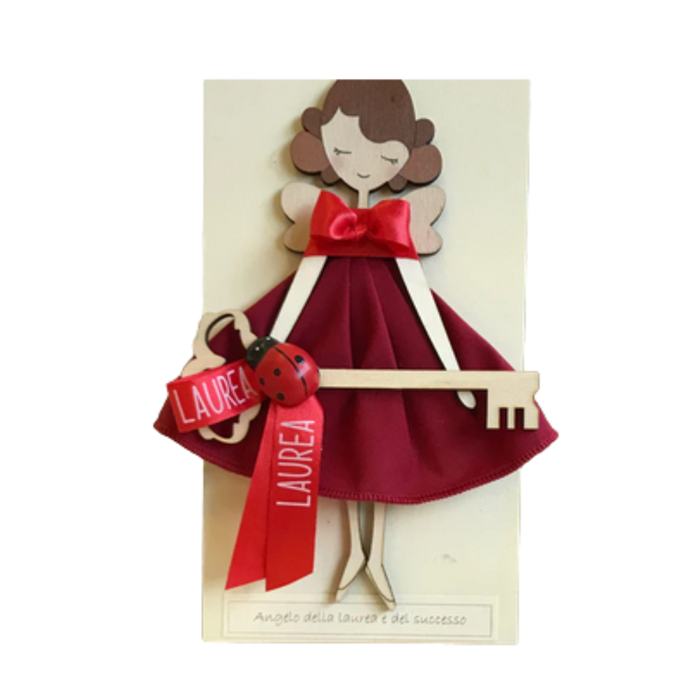 Bellissimo quadretto con l'Angelo della laurea con indosso un abito rosso, arricchito da un fiocchetto, la scritta laurea con coccinella ed una chiave.