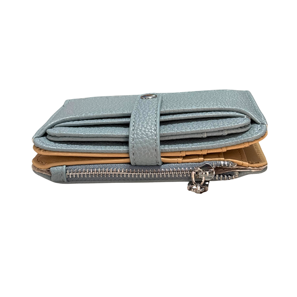 Il portafoglio si chiude con un bottoncino, ha delle tasche porta carte di credito (estraibile) e delle taschine interne, un vano porta banconote ed una tasca con chiusura a zip porta monete.