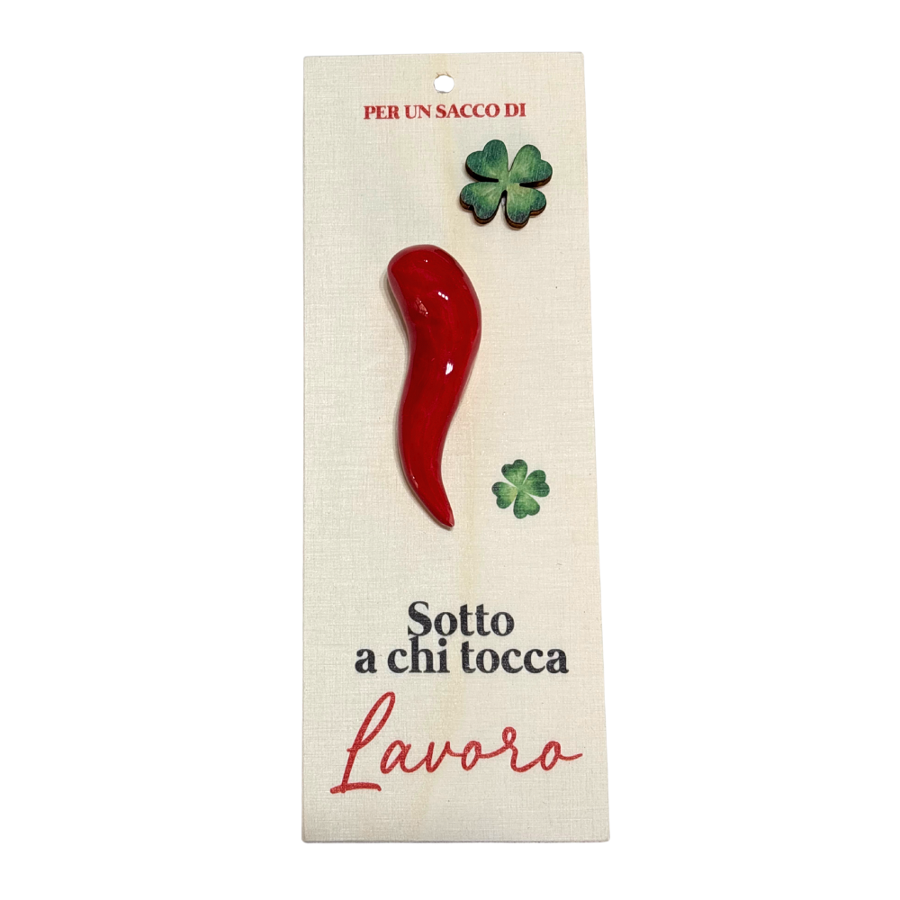 Accompagnato da un bigliettino, con la scritta "Il cornetto portafortuna e i messaggi del cuore. Direttamente dal nostro laboratorio il cornicello artigianale napoletano" e da una scatola.
