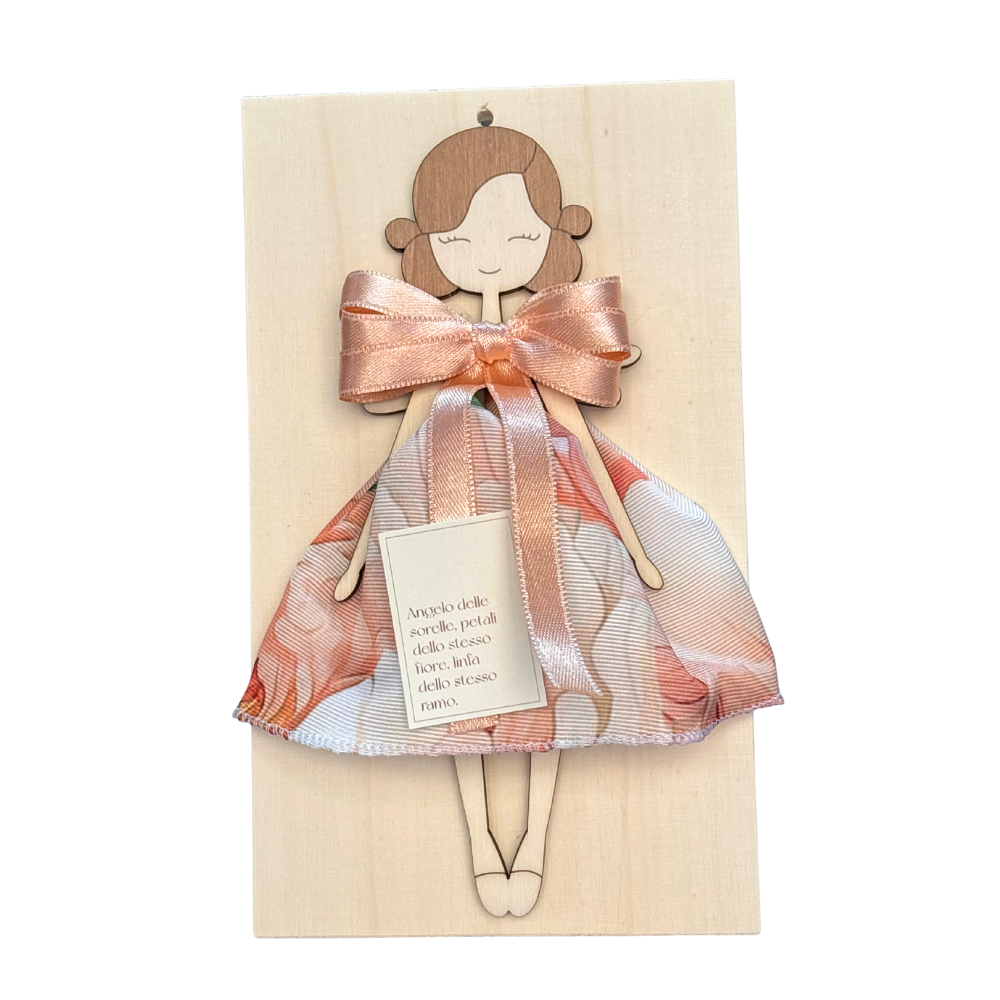 Bellissimo quadretto con l'Angelo delle sorelle con indosso un vestitino a fiori ed un fiocco coordinato con un biglietto: "Angelo delle Sorelle, petali dello stesso fiore, linfa dello stesso ramo".