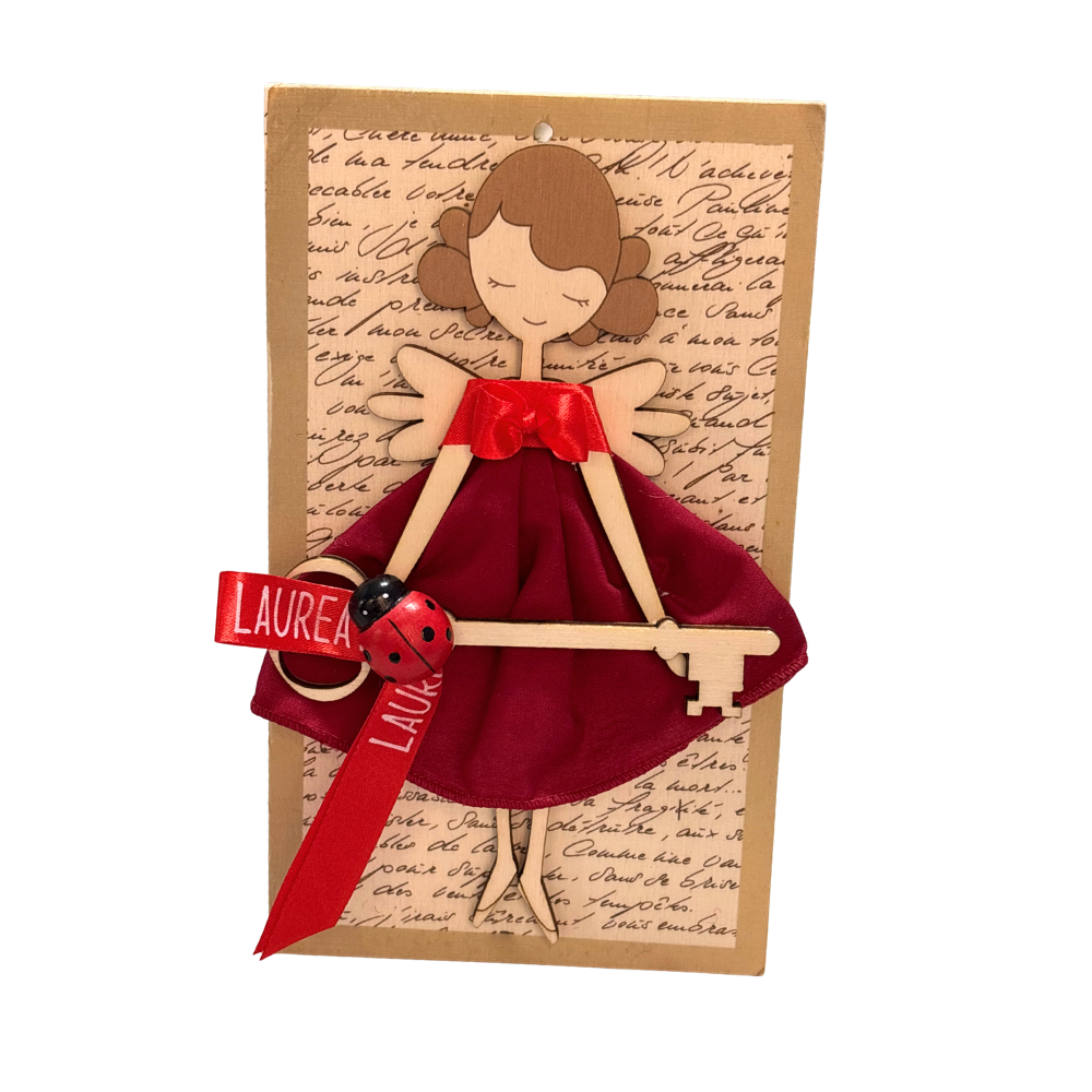 Bellissimo quadretto con l'Angelo della laurea con indosso un abito rosso, arricchito da un fiocchetto, lo sfondo calligrafico, la scritta laurea con coccinella ed una chiave.