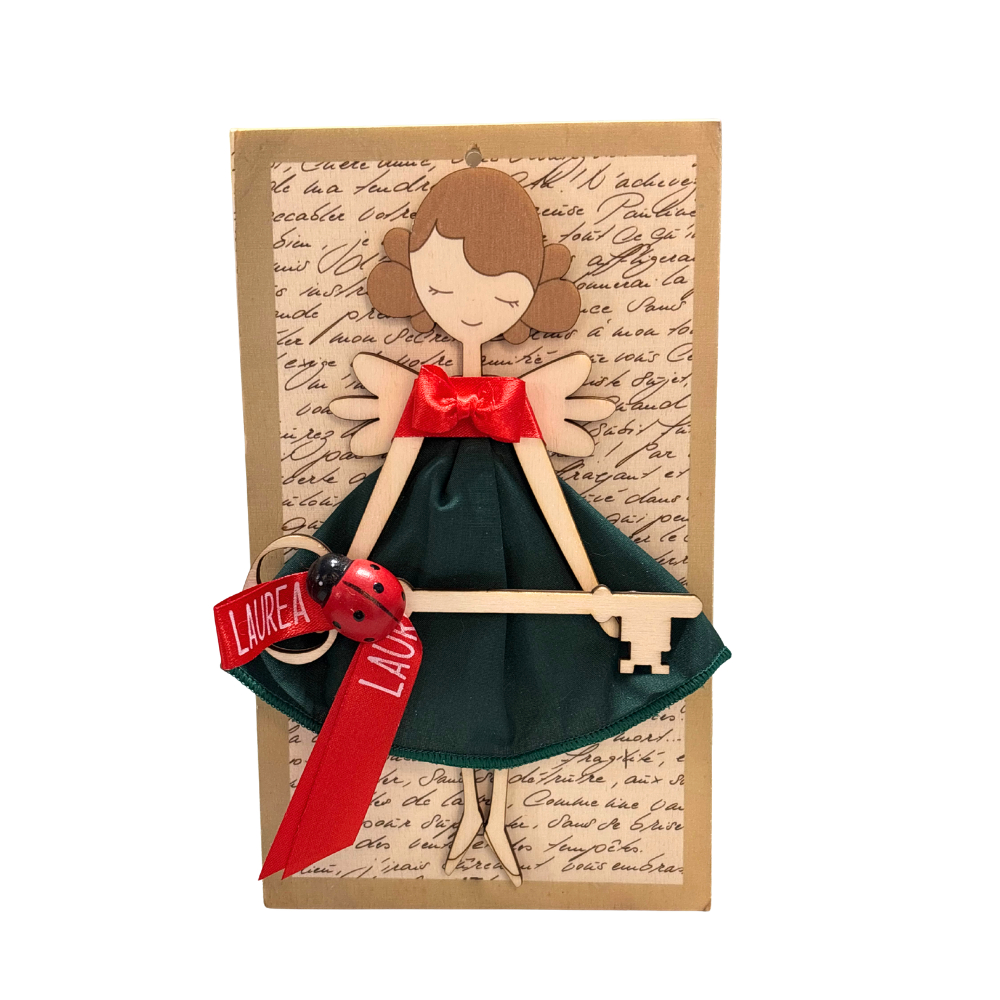 Bellissimo quadretto con l'Angelo della laurea con indosso un abito verde, arricchito da un fiocchetto, lo sfondo calligrafico, la scritta laurea con coccinella ed una chiave.