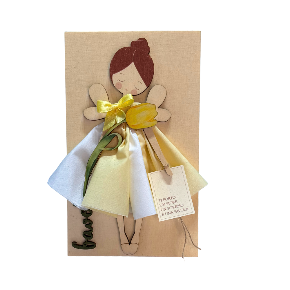 Quadretto in legno da appoggiare con l' Angelo dei Tulipani, vestito con l'abito corolla.