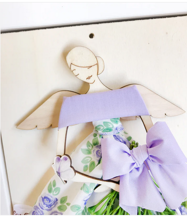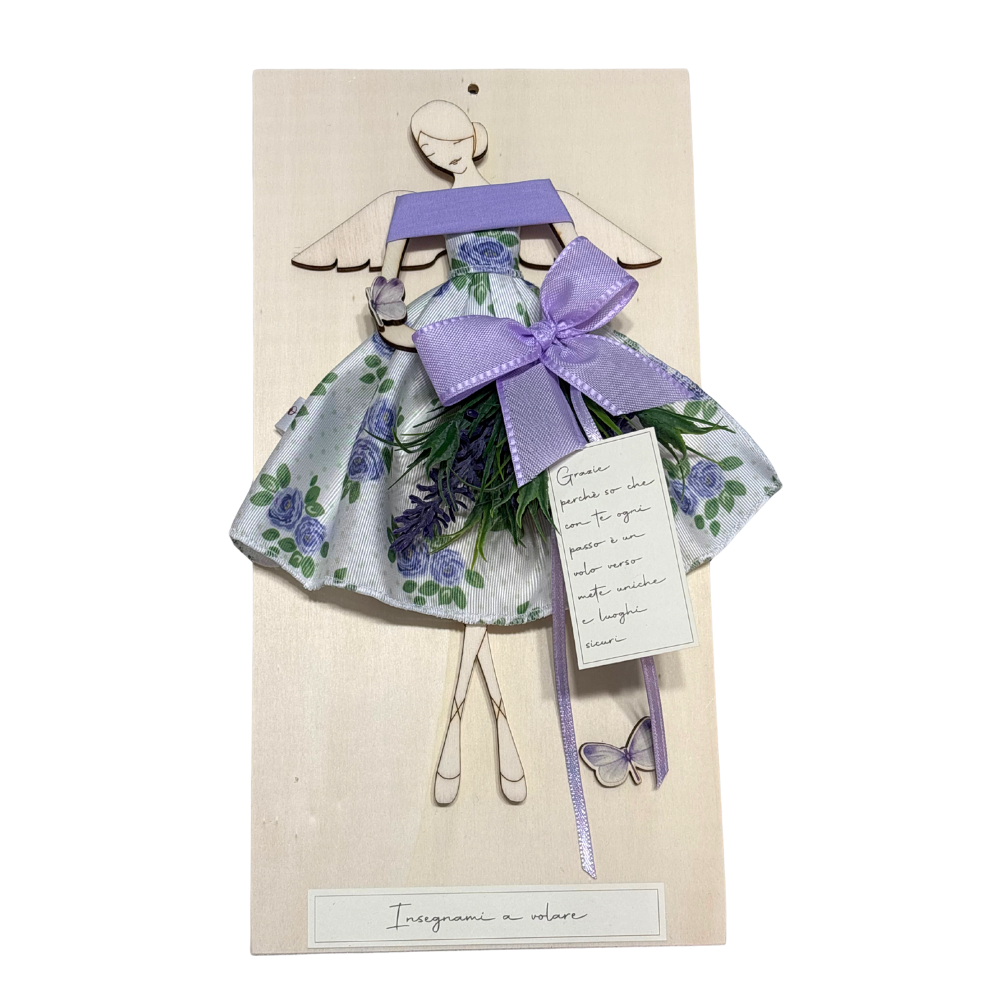 L'Angelo indossa un abitino con fiori. In mano un mazzolino di lavanda. In aggiunta fiocchetti e farfalline.