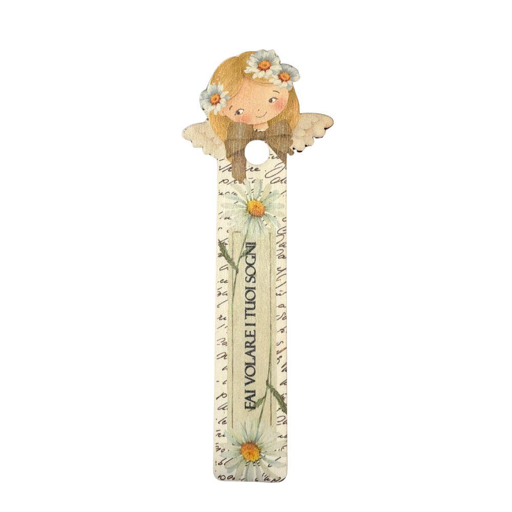 Il segnalibro presenta un angioletto stilizzato con una coroncina di fiori sulla parte superiore e decorazioni floreali, delle margherite, lungo il corpo del segnalibro.