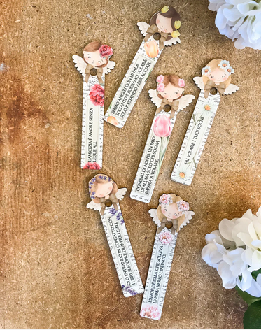 Il segnalibro è a forma di Angelo stilizzato, decorato con tulipani e la frase "Siamo angeli con un'ala soltanto e possiamo volare solo restando abbracciati" è una citazione popolare che sottolinea l'importanza dell'unione e del sostegno reciproco.