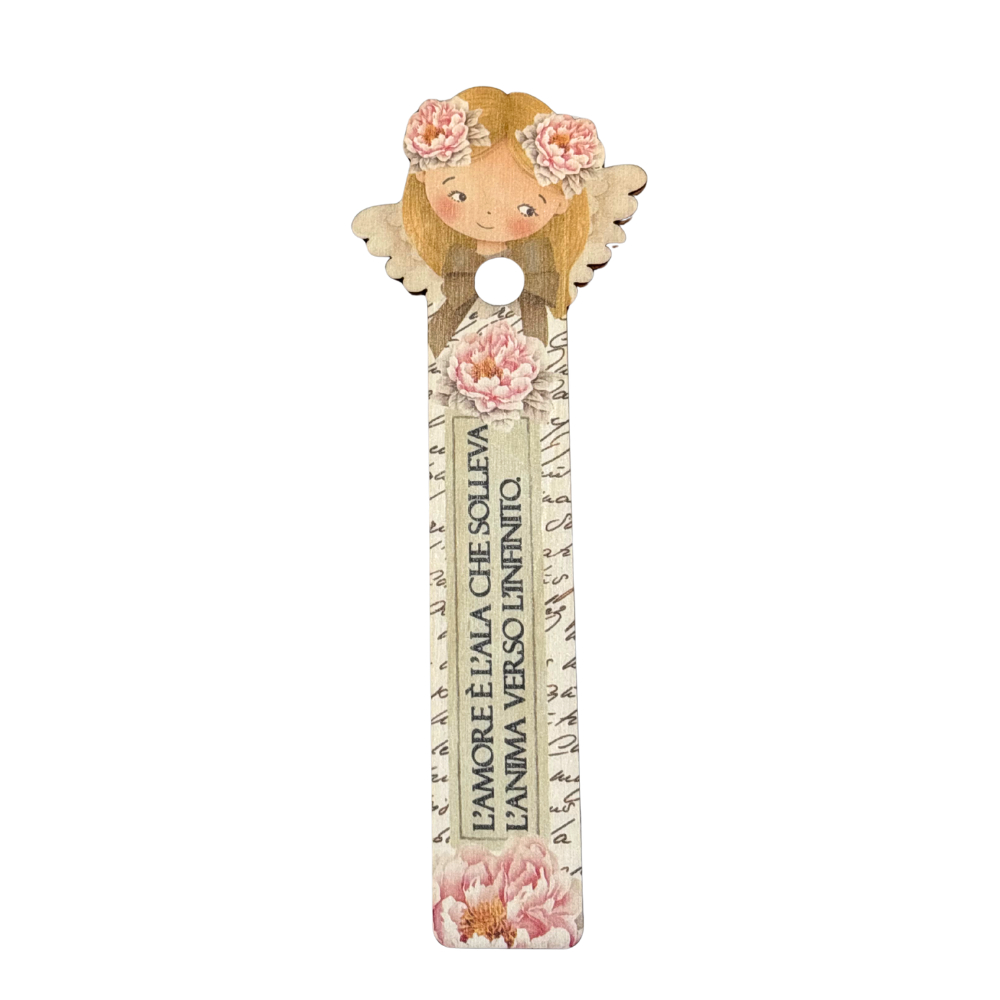 Il segnalibro, decorato con un angelo stilizzato e una frase "L'amore è l'ala che solleva l'anima verso l'infinito", ha una forma sagomata che richiama un angelo con le ali.
