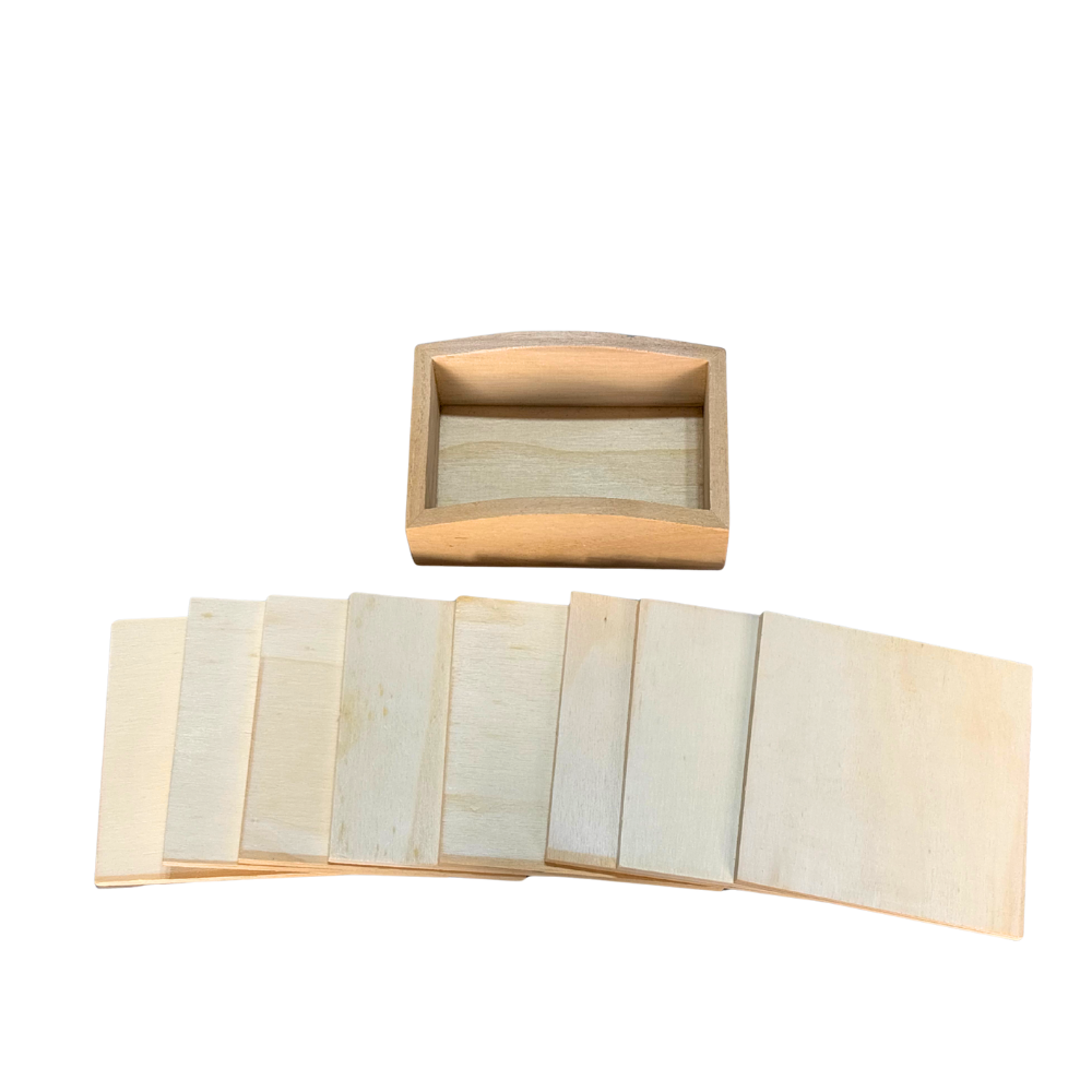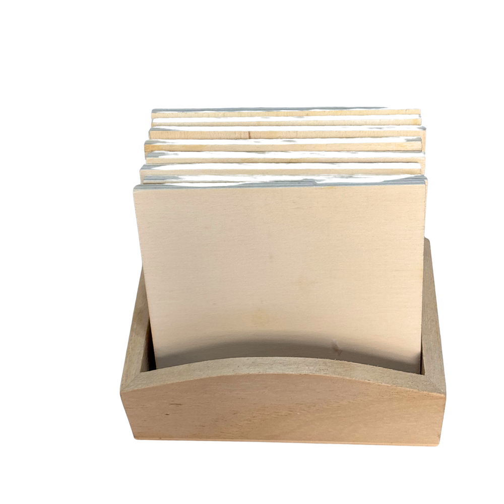 Set di 8 sottobicchieri in legno con contenitore per poterli riporre.