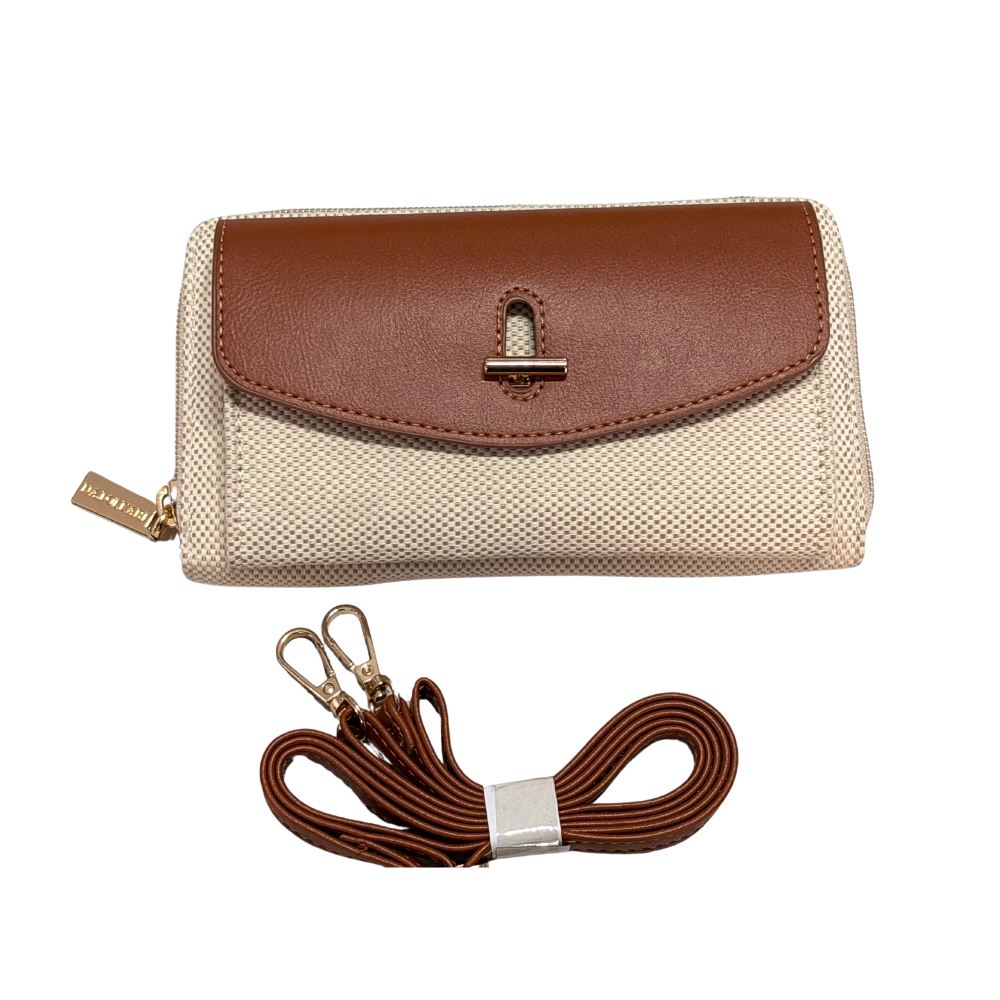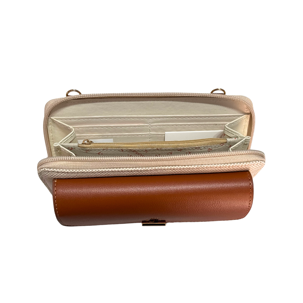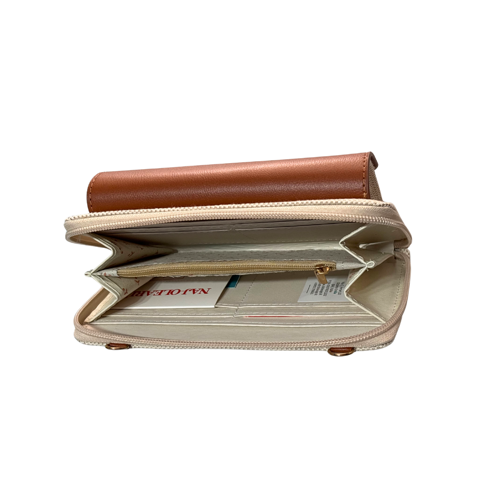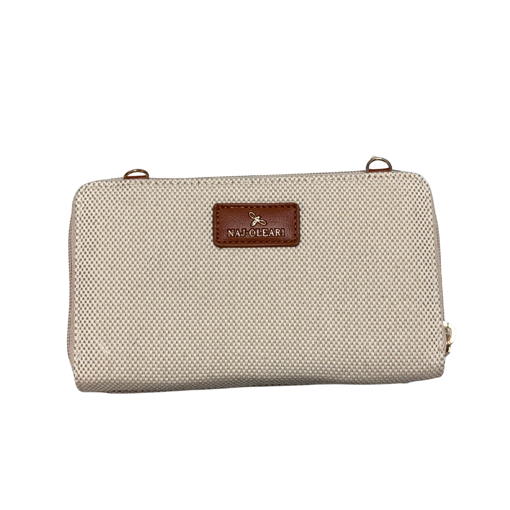 All'interno un portafoglio: scompartimento centrale con cerniera, due vani porta banconote laterali con porta tessere.
