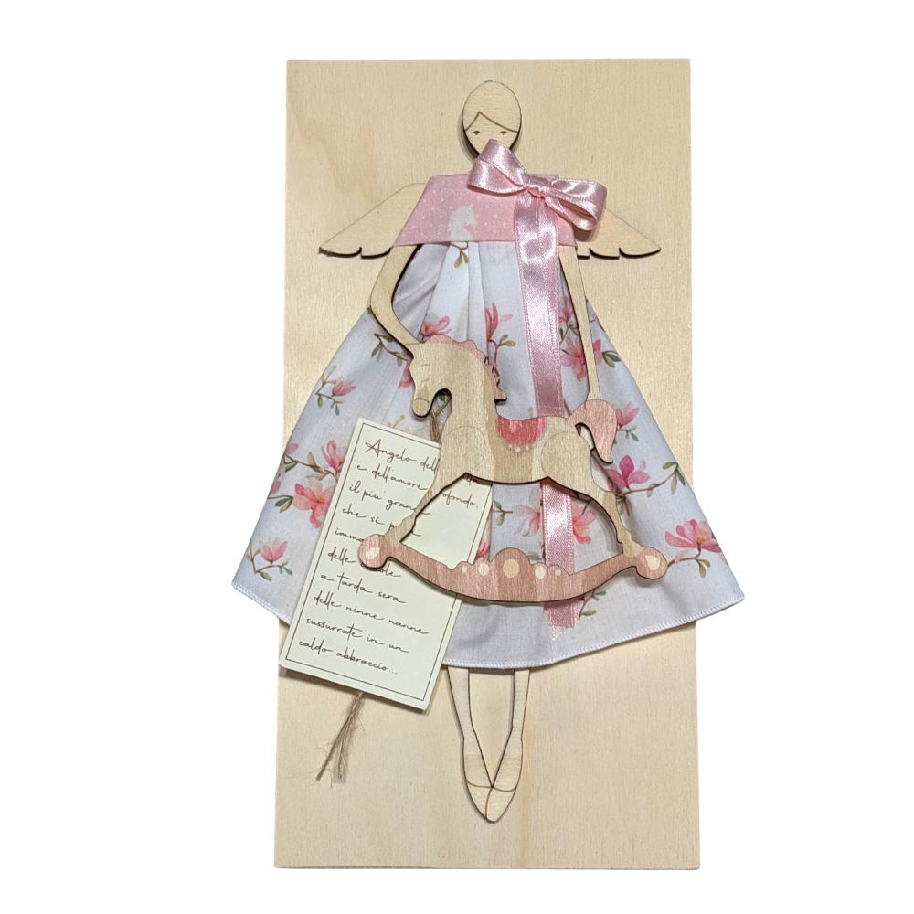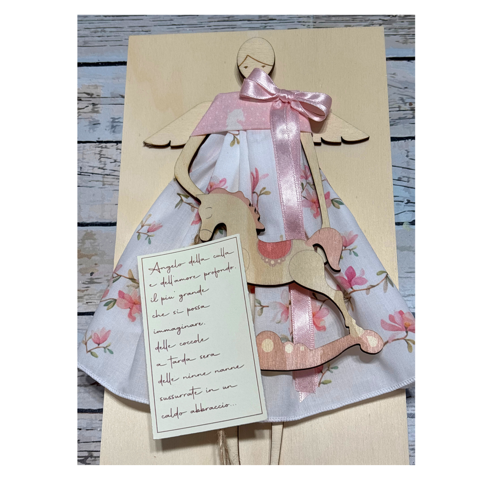 L'angelo è disegnato nel laboratorio creativo dell'azienda italiana su di un supporto in legno e decorato a mano, con tessuti pregiati di manifattura sempre italiana.