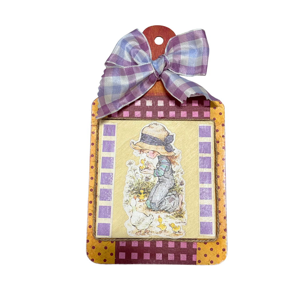 Un quadretto in legno a forma di tagliere, ad uso solo decorativo, molto leggero e di pochissimo spessore, con raffigurata Sarah Kay, realizzato e decorato artigianalmente in Italia, in stile shabby-chic e vintage.