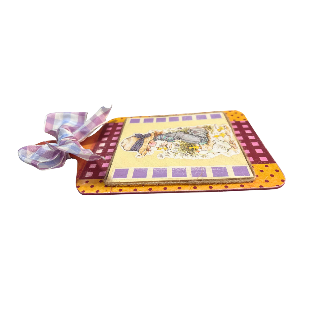 Il desin include due pezzi sovraposti (il tagliere e la targhetta), un bel nastrino a quadretti nelle tonalità del rosa e dell'azzurro ed una base con motivi a pois e scacchi colorati.