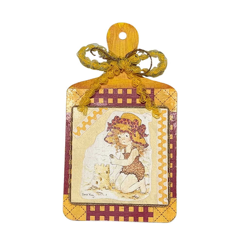 Un quadretto in legno a forma di tagliere, ad uso solo decorativo, molto leggero e di pochissimo spessore, con raffigurata Sarah Kay, realizzato e decorato artigianalmente in Italia, in stile shabby-chic e vintage.