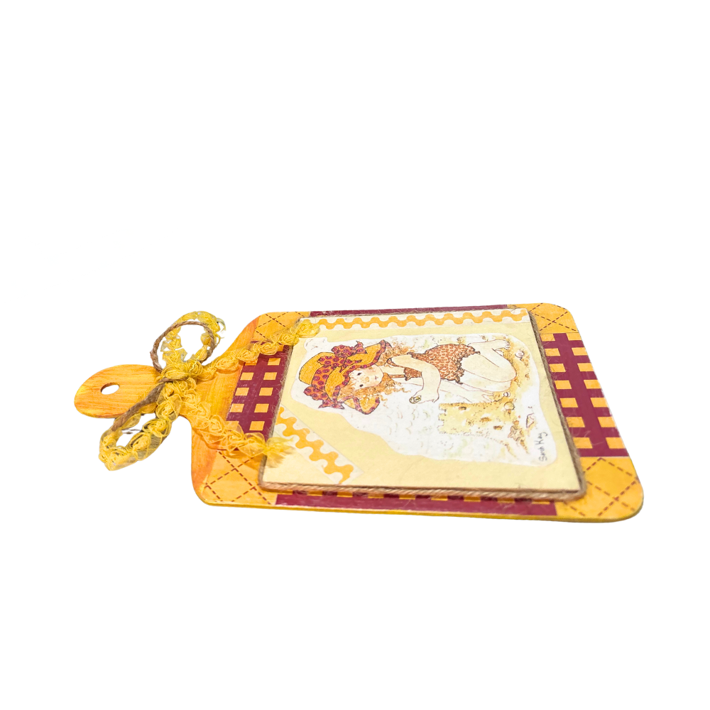 Il desin include due pezzi sovraposti (il tagliere e la targhetta), un bel nastrino con roselline e corda nelle tonalità del giallo e del marrone ed una base con motivi a quadri.
