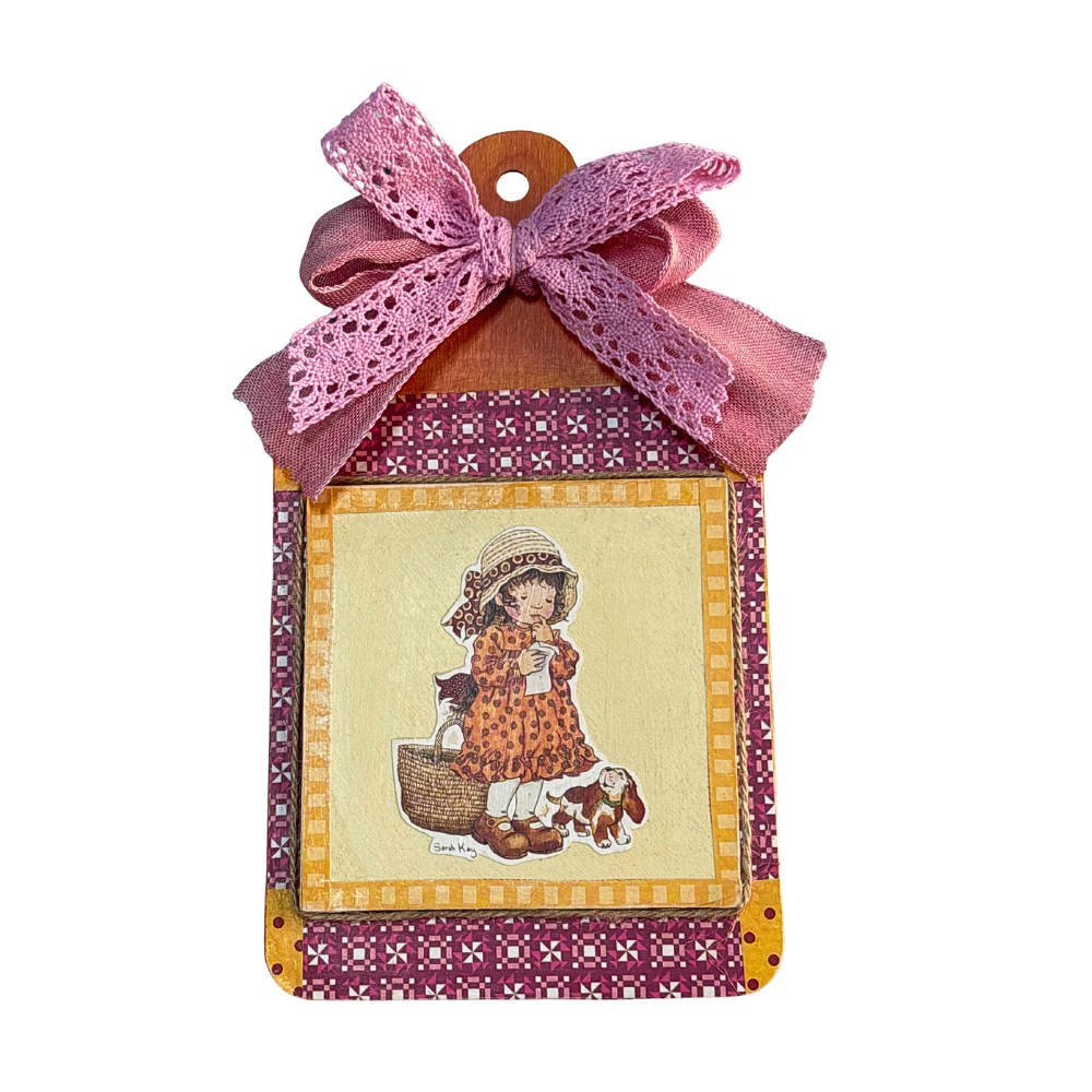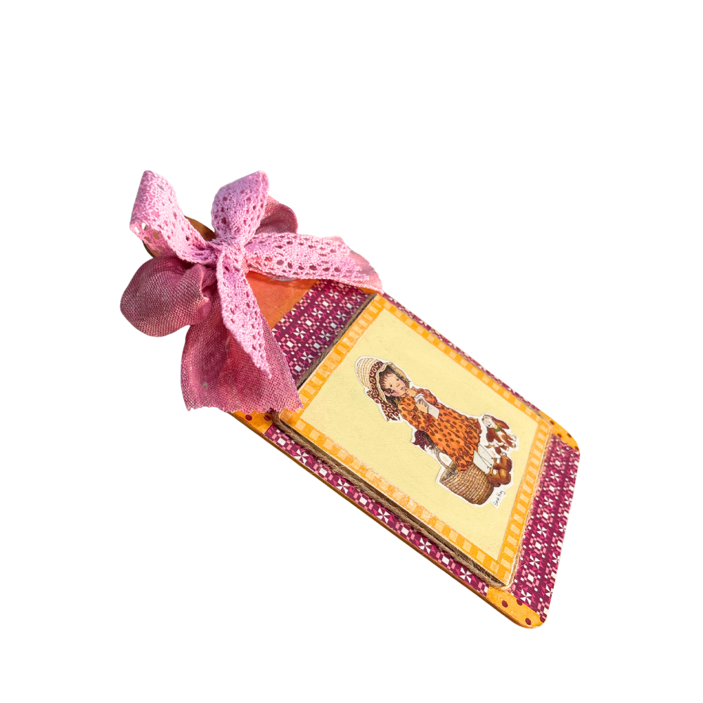 Un quadretto in legno a forma di tagliere, ad uso solo decorativo, molto leggero e di pochissimo spessore, con raffigurato un personaggio di Sarah Kay, realizzato e decorato artigianalmente in Italia, in stile shabby-chic e vintage.