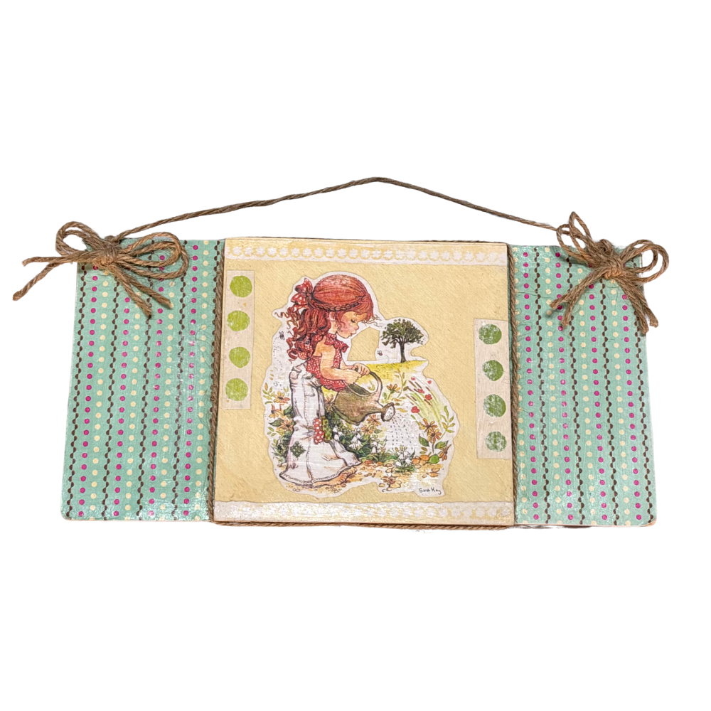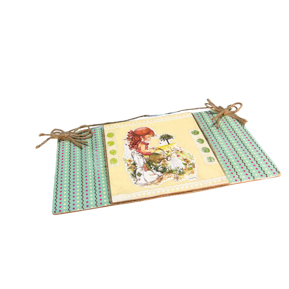 Un quadretto in legno a forma di tagliere, ad uso solo decorativo, molto leggero e di pochissimo spessore, con raffigurato un personaggio di Sarah Kay, realizzato e decorato artigianalmente in Italia, in stile shabby-chic e vintage.
