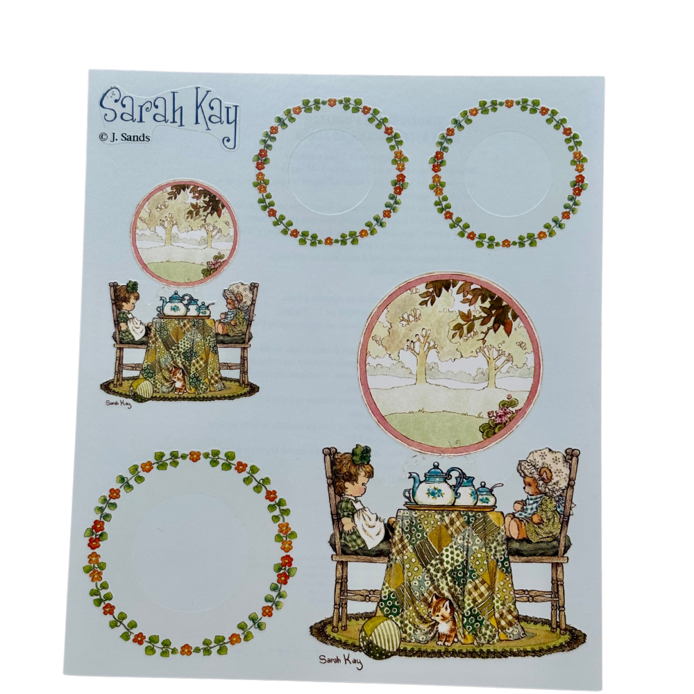 Il foglio raffigura diverse scene e elementi decorativi tipici dello stile di Sarah Kay, inclusi personaggi, motivi floreali e oggetti come piatti e teiere.