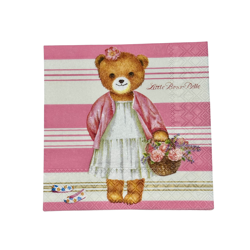 Il tovagliolo raffigura un orsetto di peluche vestito con un abitino bianco che tiene in mano un cestino di fiori su uno sfondo a righe rosa e bianco. Sullo sfondo una scritta "Little Bear Belle.