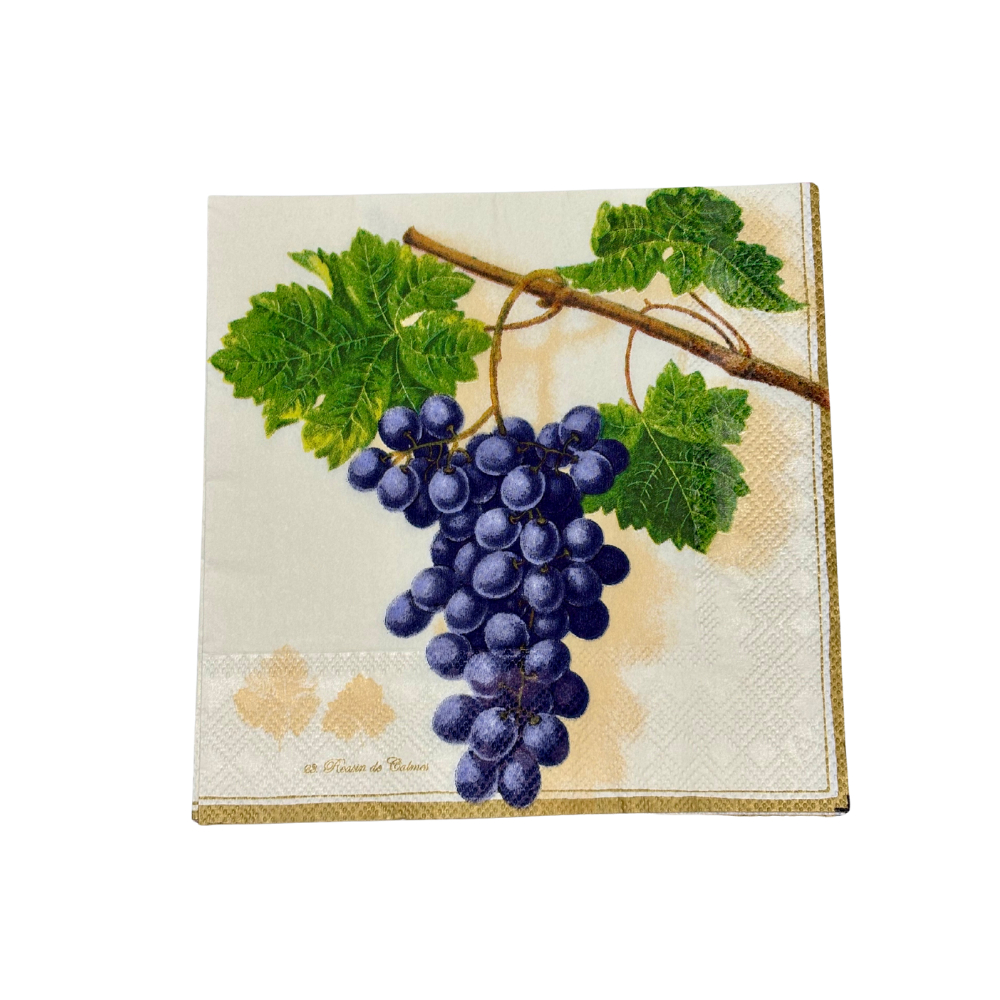 Il tovagliolo raffigura un grappolo d'uva viola con foglie verdi, su uno sfondo chiaro con bordi dorati. Ideale da utlizzare per creare un tipico quadretto Autunnale!