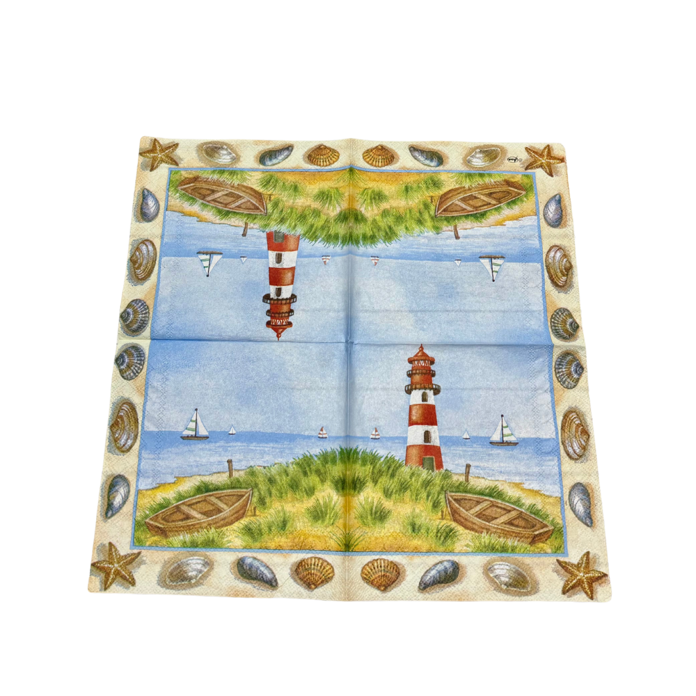 Il tovagliolo raffigura un motivo marittimo e più precisamente elementi nautici: faro, barche a vela, conchiglie e stelle marine.