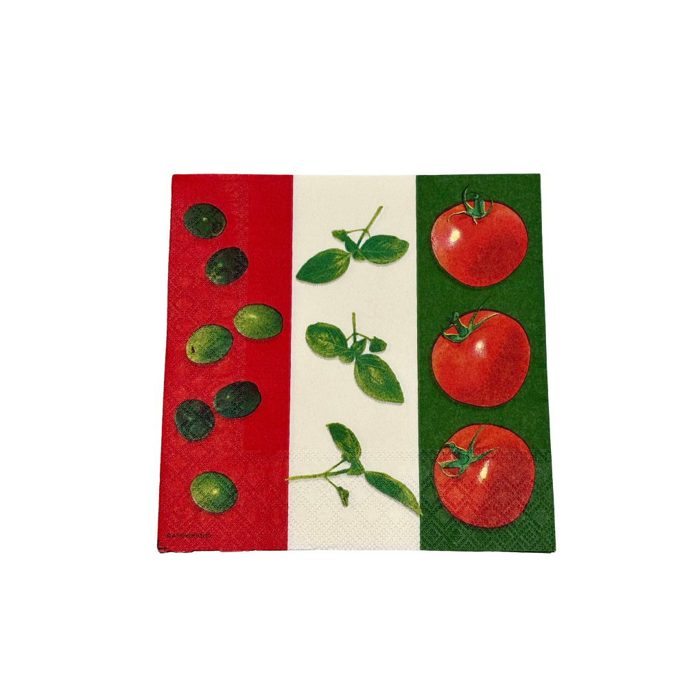 Il tovagliolo raffigura delle olive, delle foglie di basilico e dei pomodori.