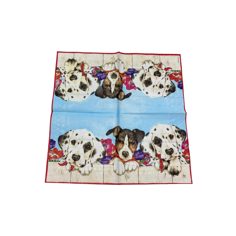 Il tovagliolo raffigura dei cuccioli di cagnolini con dei fiori.