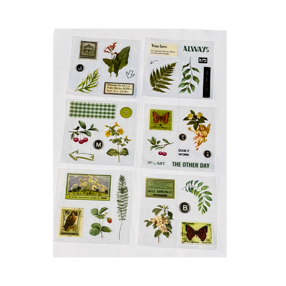 Gli stickers presentano elementi che richiamano decorazioni floreali, foglie e farfalle.