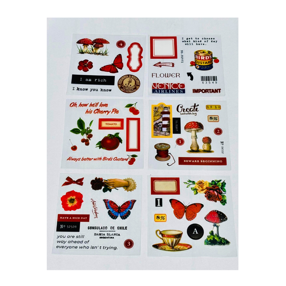 Il set include una varietà di stickers in stile vintage, con un focus su frafalle, funghi e scritte.