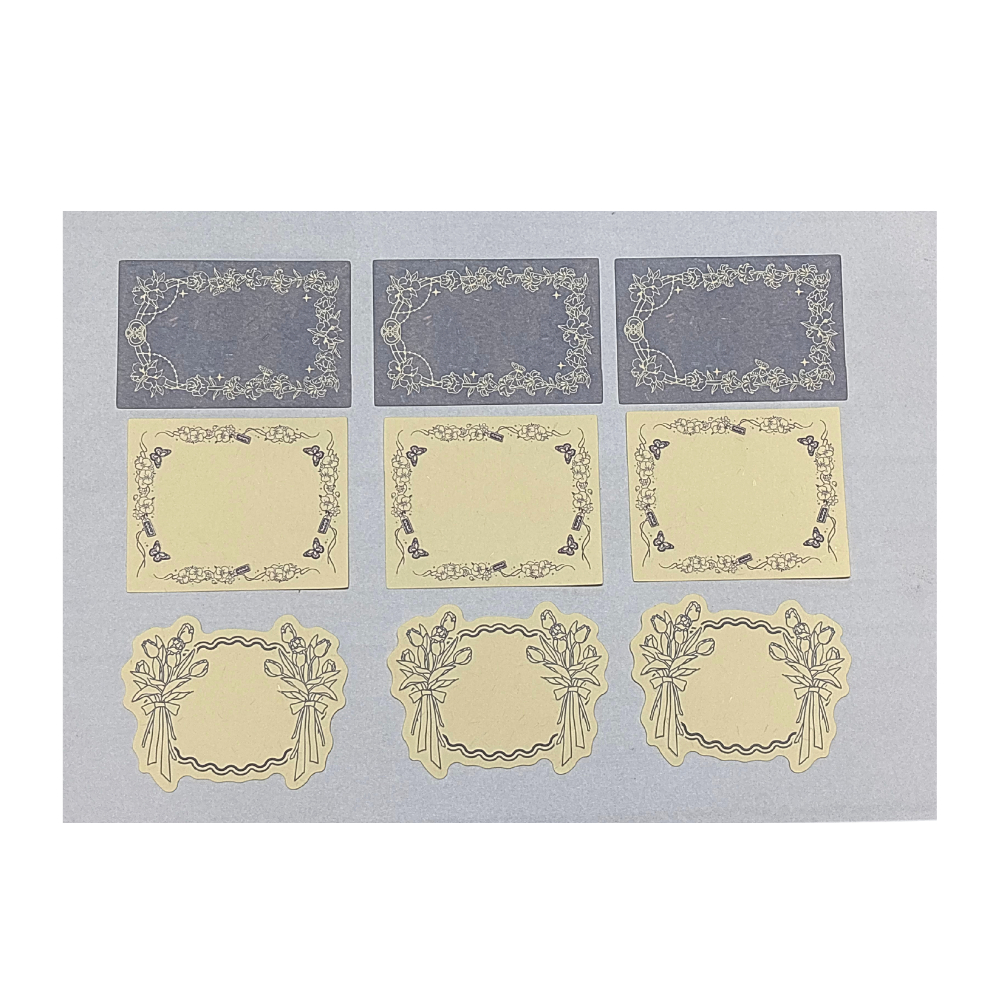 Il set comprende 9 cartoncini decorativi con cornici floreali e farfalle da utilizzare come preferisci, per esempio come etichette.