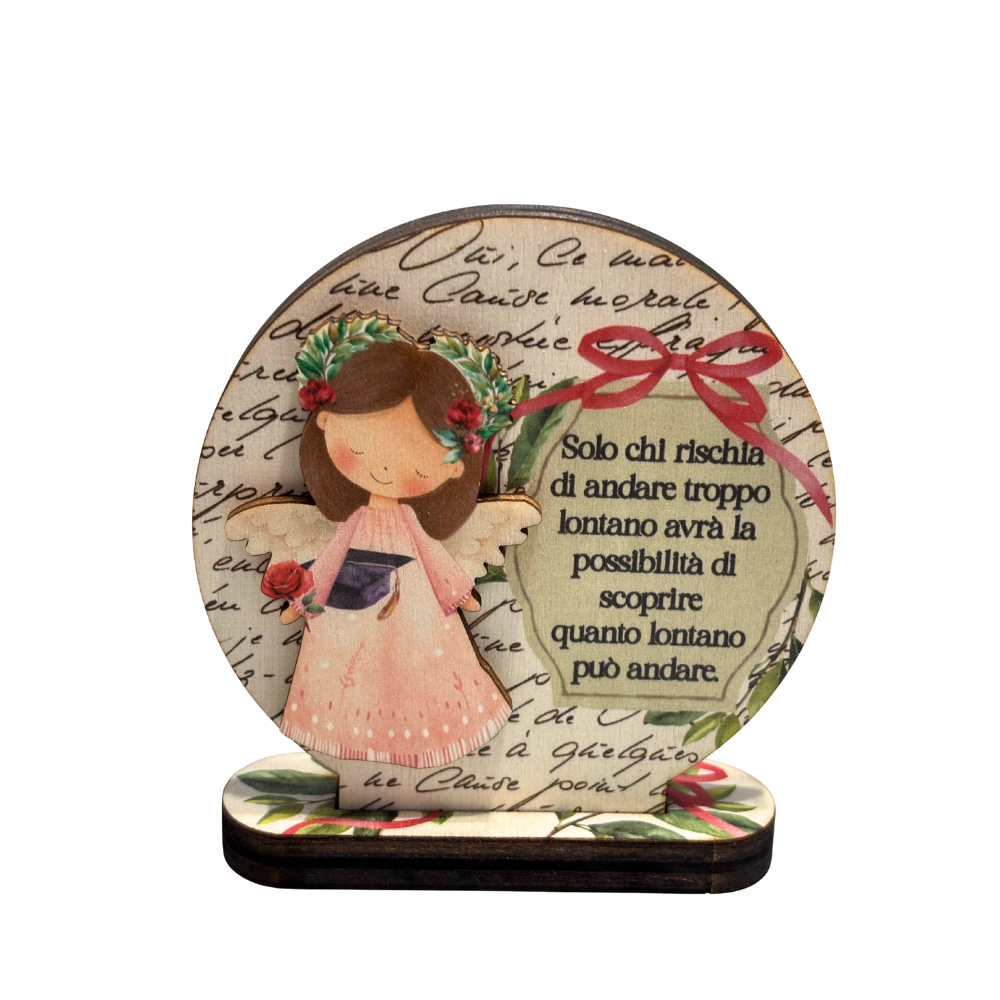 Questa deliziosa Sfera con l'Angelo Floreale della Laurea in legno è un piccolo quadretto da appoggiare, un vero inno alla delicatezza.