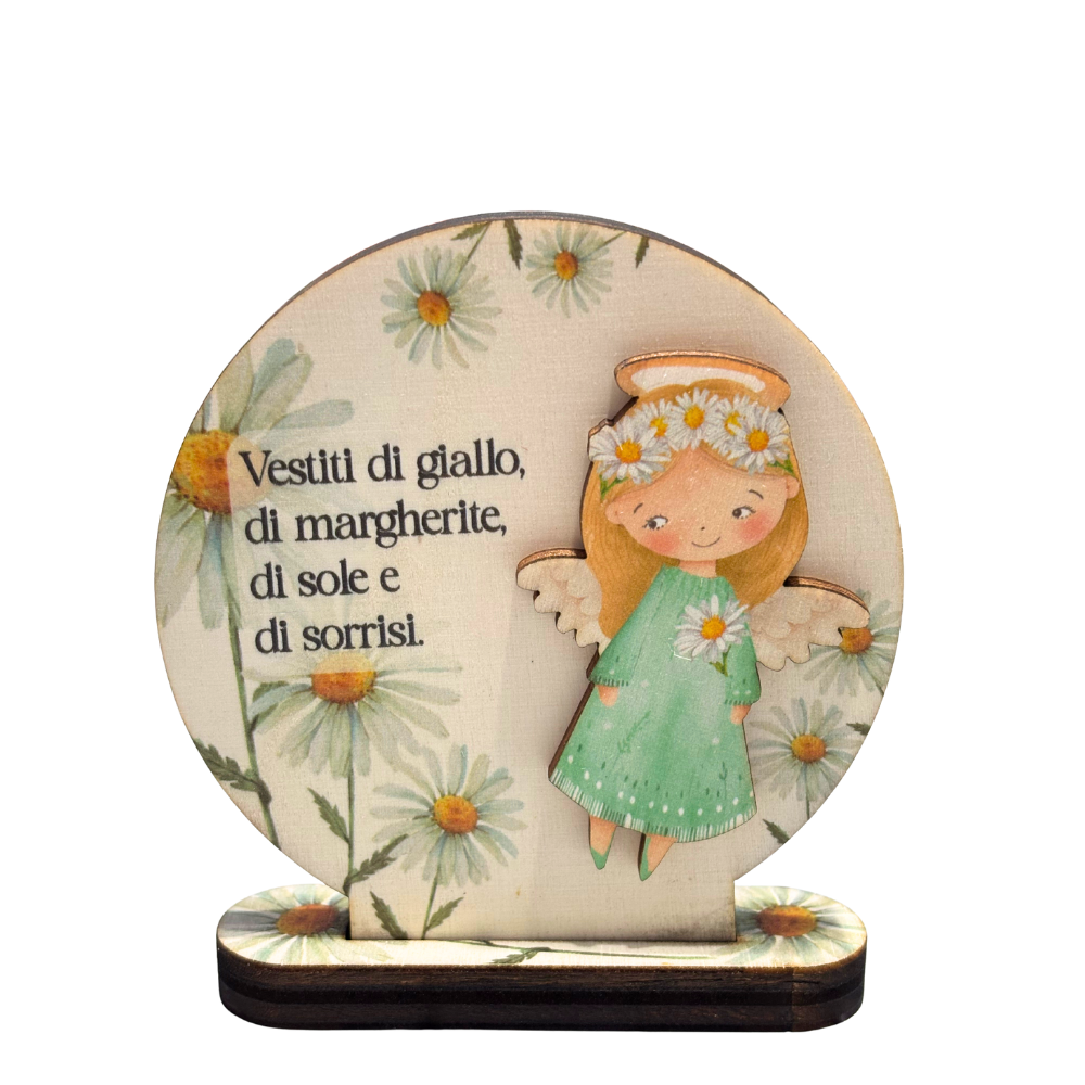 Questa deliziosa Sfera con l'Angelo Floreale con le Margherite in legno è un piccolo quadretto da appoggiare, un vero inno alla delicatezza.