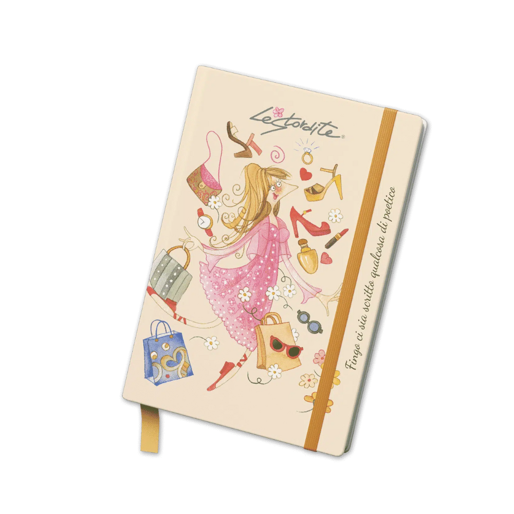 Design che fa sorridere: La copertina semirigida è un vero e proprio quadro, illustrato con un mix irresistibile di accessori glamour: eleganti scarpe con tacco, borse alla moda e occhiali chic 👠👛🕶️. Il titolo "Le Stordite" è un pretesto per il vero protagonista, un sottotitolo che rivela l'anima del quaderno: "Fingo ci sia scritto qualcosa di poetico". È una frase che rompe gli schemi e ti invita a prendere la vita con leggerezza, trasformando ogni appunto in un piccolo atto di creatività.