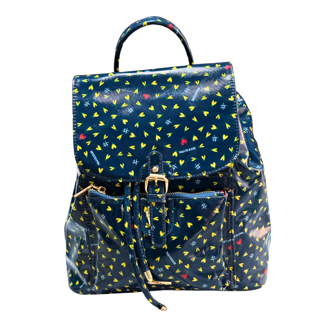 Un pezzo statement che cattura gli sguardi! Lo Zaino Naj-Oleari della linea Adalie unisce il look casual del jeans alla brillantezza di una finitura inedita. 💎 Realizzato in canvas stampato con l'adorabile pattern a cuori ❤️, è rivestito da uno strato spalmato in sottovetro che conferisce un meraviglioso effetto lucido e una maggiore resistenza.