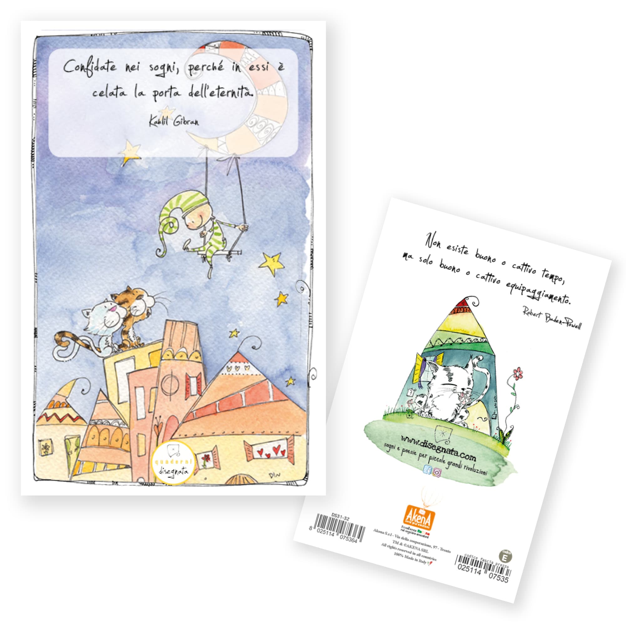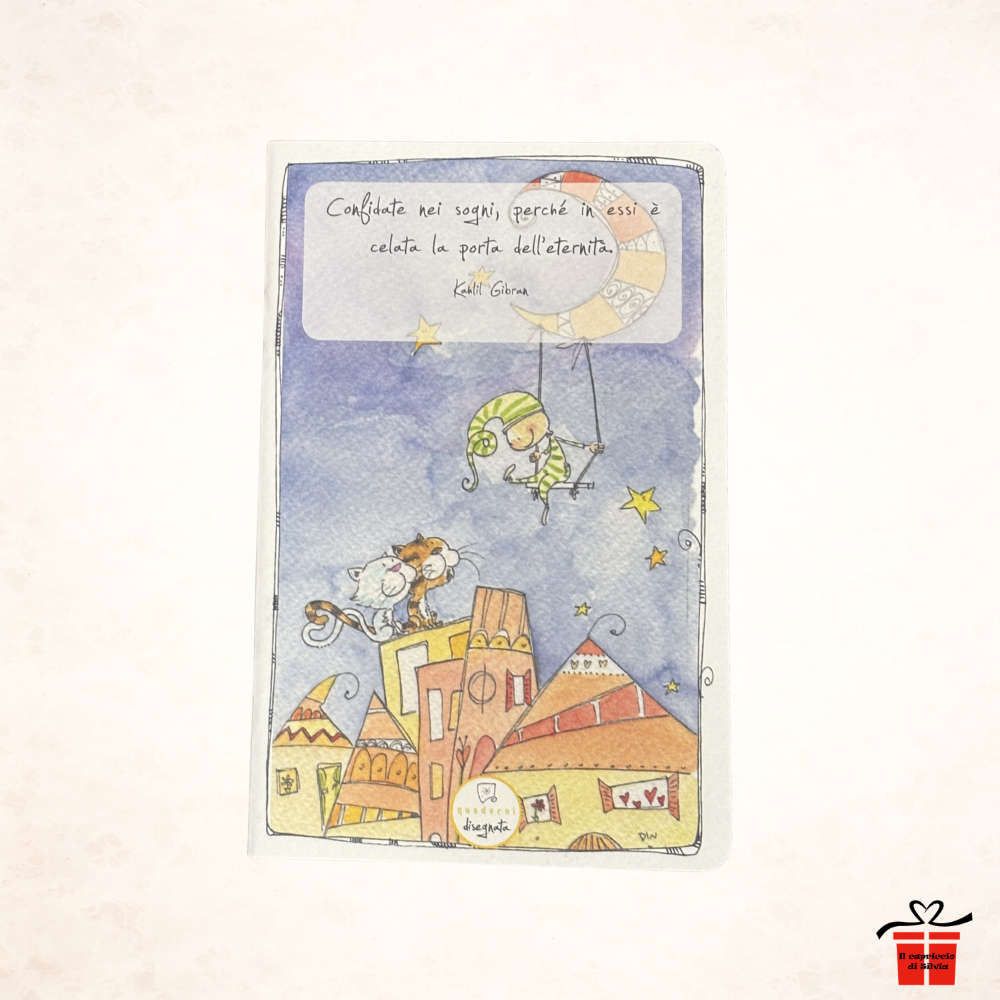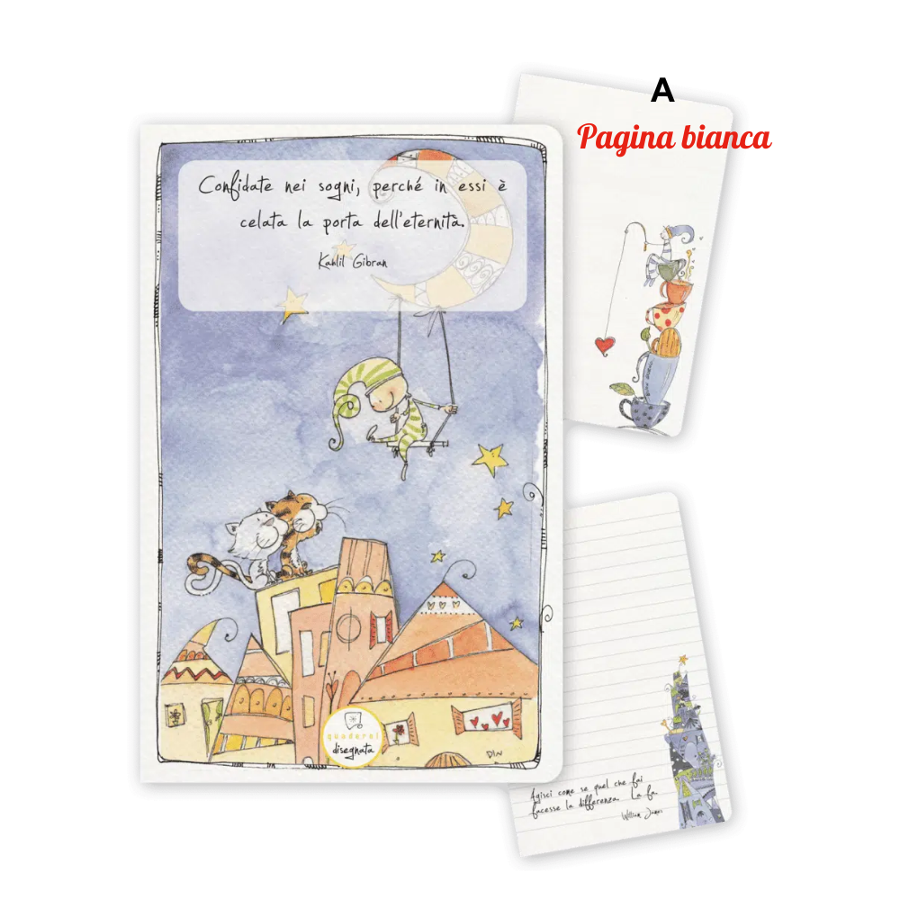 Un taccuino d'autore interamente Made in Italy che unisce poesia e sostenibilità. Questo quaderno della linea "Disegnata" è un piccolo scrigno di bellezza dove i gattini e la luna sono i protagonisti di un'illustrazione sognante. Non è solo un supporto per scrivere, ma un viaggio tra illustrazioni ad acquerello e aforismi ispiratori, pensato per chi ama circondarsi di dolcezza nel rispetto dell'ambiente.