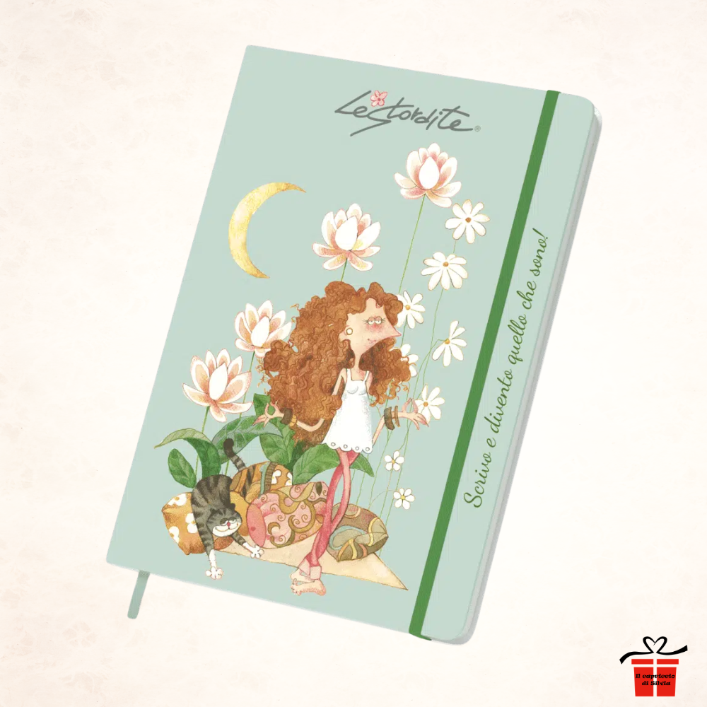 Un quaderno dall'anima sognante e artistica firmato Akena Italy. La copertina, in un delicato color verde acqua, ospita l'illustrazione di una ragazza dai lunghi capelli ricci e rossi, ritratta scalza e in un momento di totale relax e meditazione. Accanto a lei, un gattino tigrato sonnecchia beato su dei cuscini colorati, mentre intorno sbocciano grandi fiori di loto bianchi e margherite che salgono verso una falce di luna dorata. A chiudere questa scena poetica, la frase motivazionale scritta lungo l'elastico: "Scrivo e divento quello che sono!".