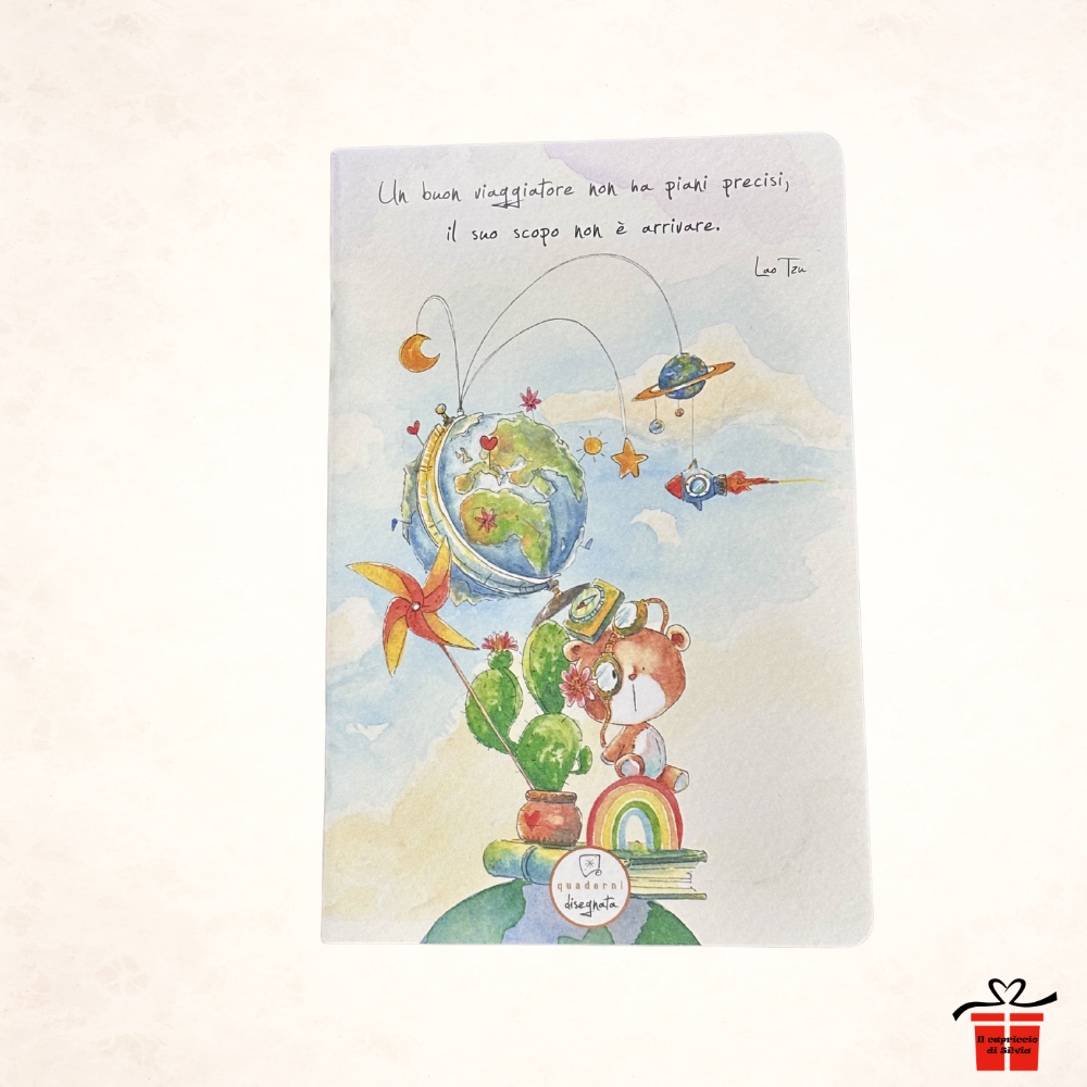 Un taccuino d'autore dedicato a chi ha sempre la valigia pronta e il cuore aperto alle novità, nato dalla creatività di Sara Pucci e Guido Olivieri. La copertina in carta ecologica martellata ritrae un tenerissimo orsetto pronto per l'avventura, accompagnato dalla celebre frase di Lao Tzu: “Un buon viaggiatore non ha piani precisi e non ha intenzione di arrivare”. Un piccolo scrigno compatto e leggero, ideale per annotare tappe, emozioni e scoperte nel pieno rispetto della natura.