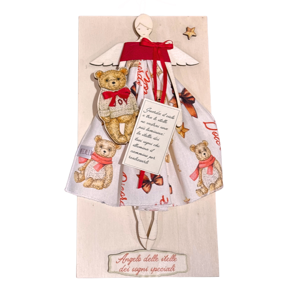 L'angelo indossa un abito in cotone decorato con dolcissimi orsetti, simboli universali di protezione e conforto. Il fiocco rosso acceso aggiunge un tocco di passione e vitalità.